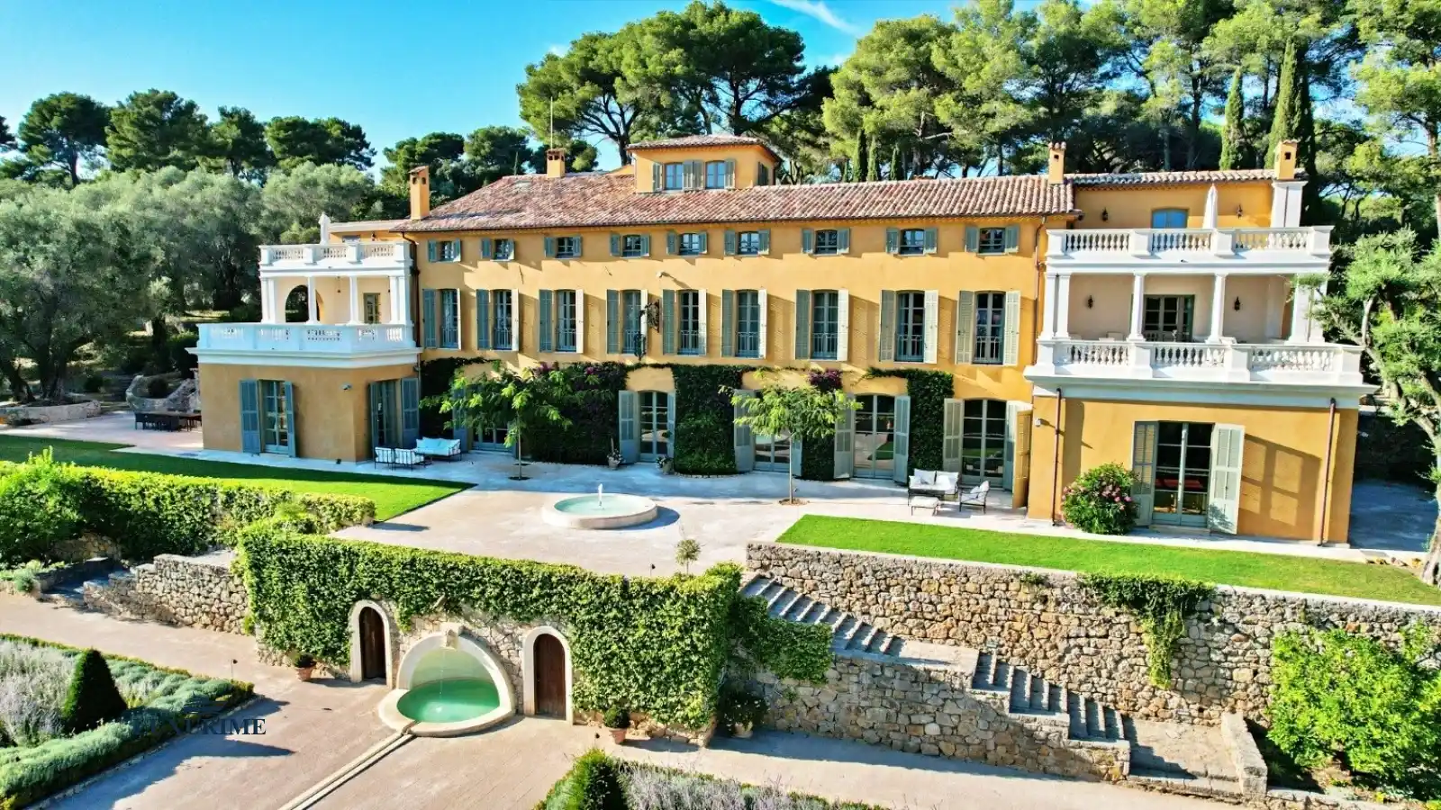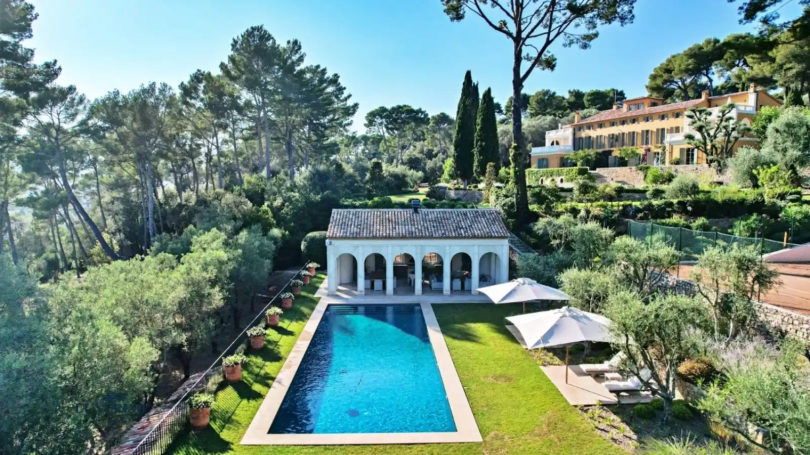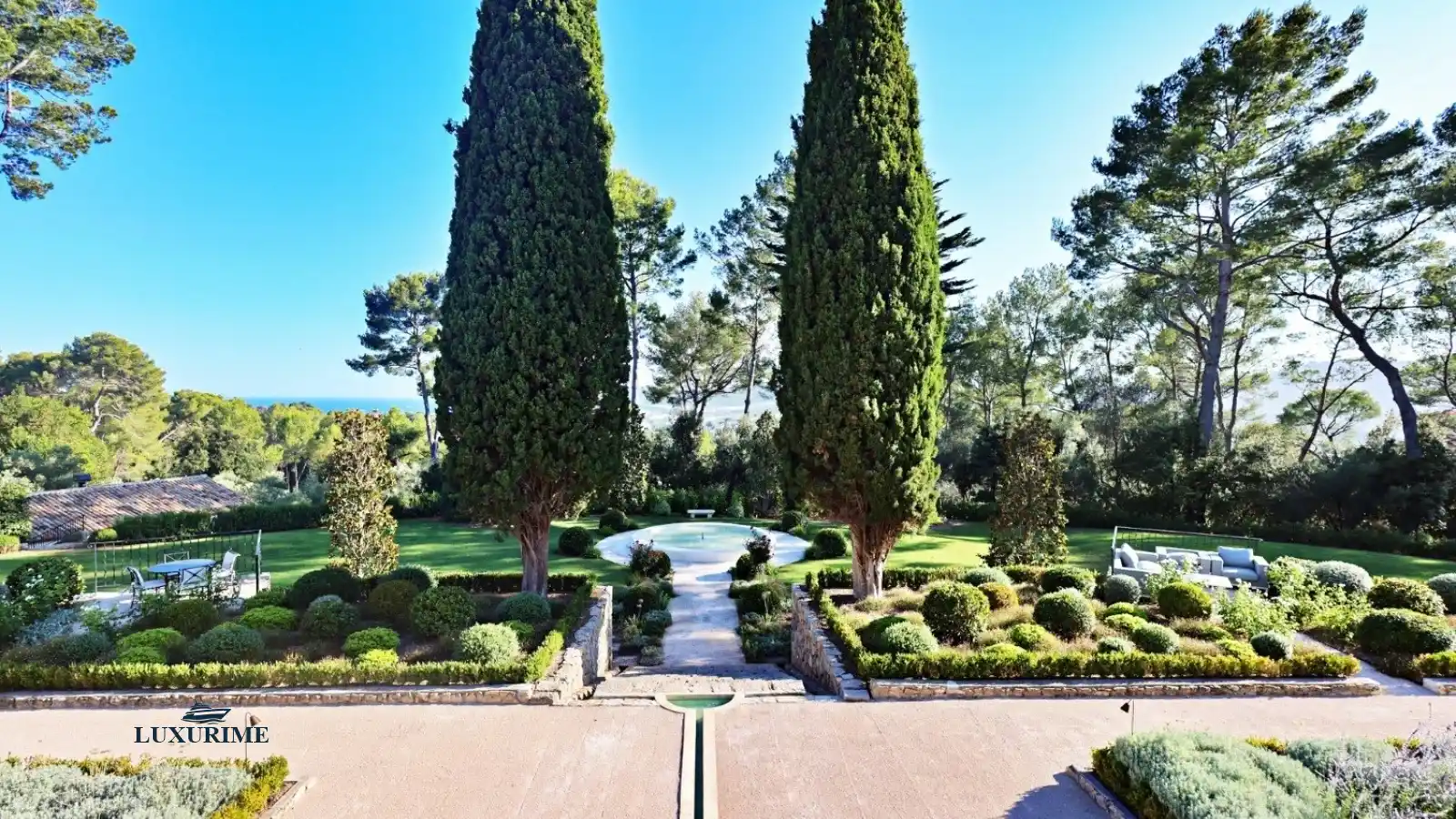 The expansive grounds create a private haven, blending French sophistication with Mediterranean charm.