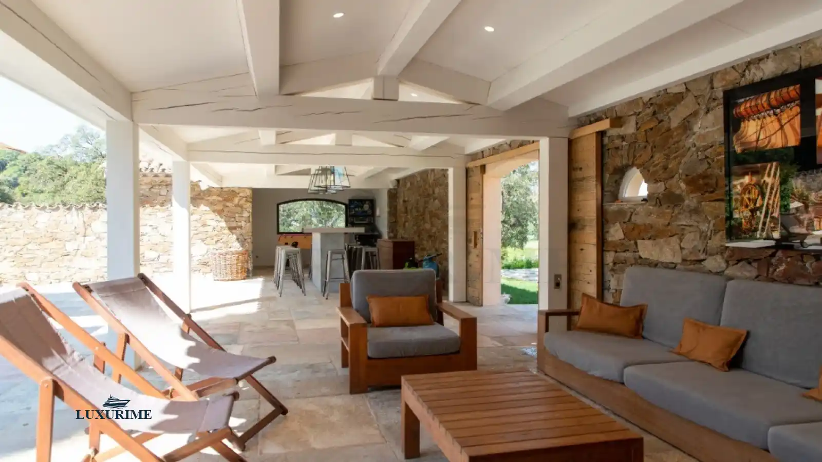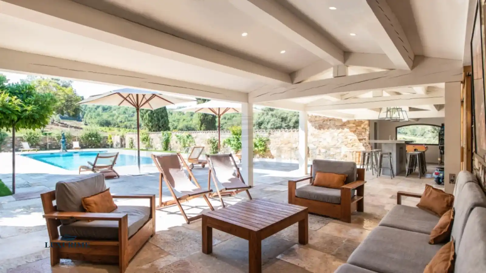 The heated swimming pool, set opposite the bastide, forms the vibrant social hub of the estate. Here, days are spent lounging under the Riviera sun, enjoying refreshing swims, and sharing gourmet moments at the outdoor high table. Friendly competition awaits at the outdoor table soccer, all while surrounded by the Olympian calm of the natural landscape.