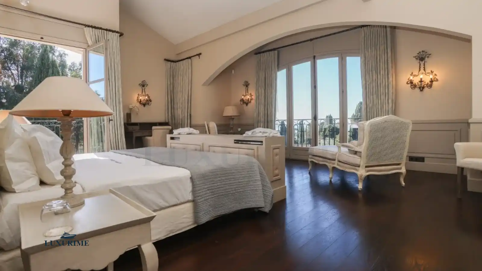 Upstairs, the master suite boasts a private terrace with breathtaking views of the Mediterranean and Juan-les-Pins Bay. Four additional Belle Époque-style bedrooms, each with en-suite bathrooms, overlook the serene gardens.
