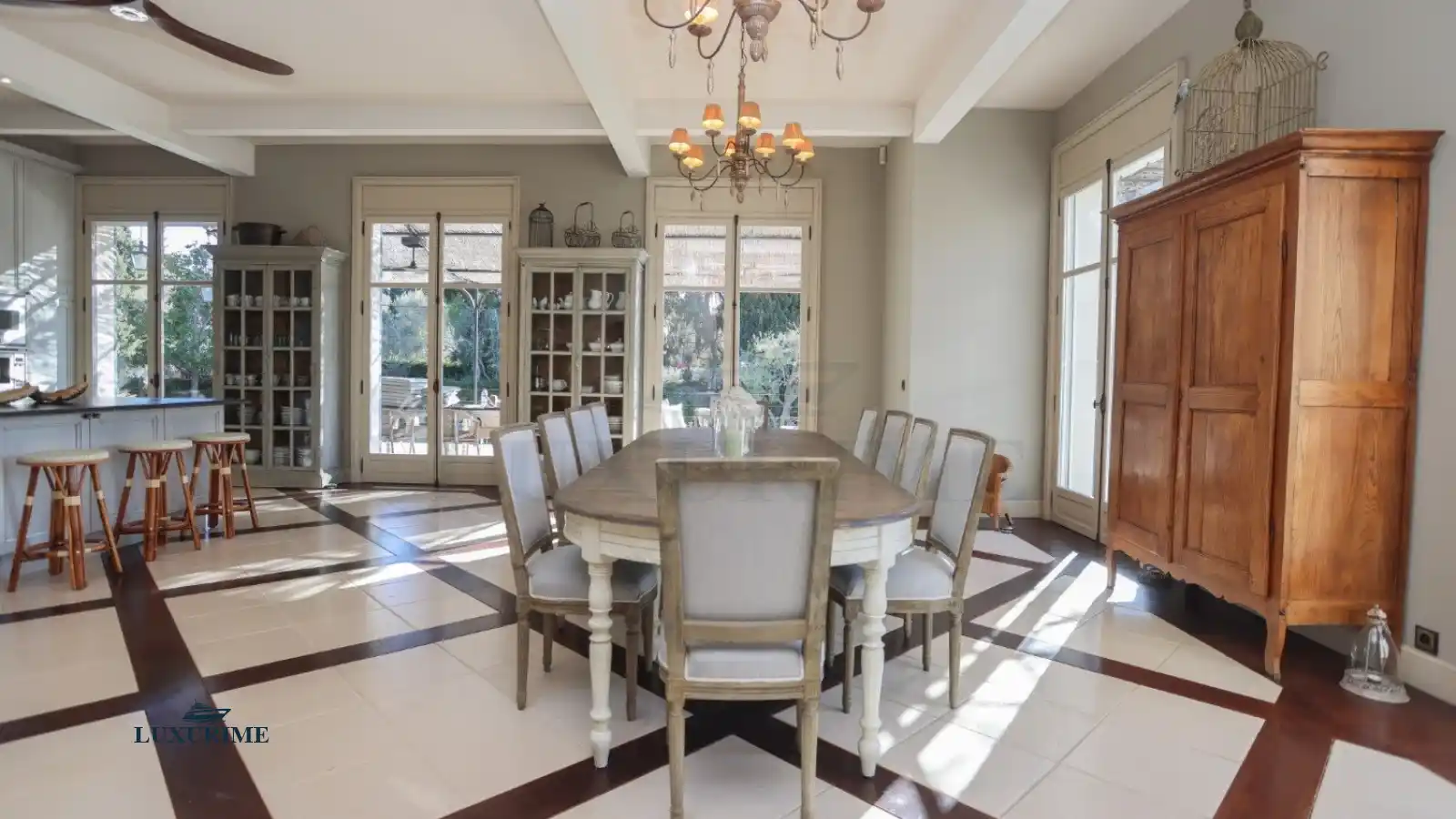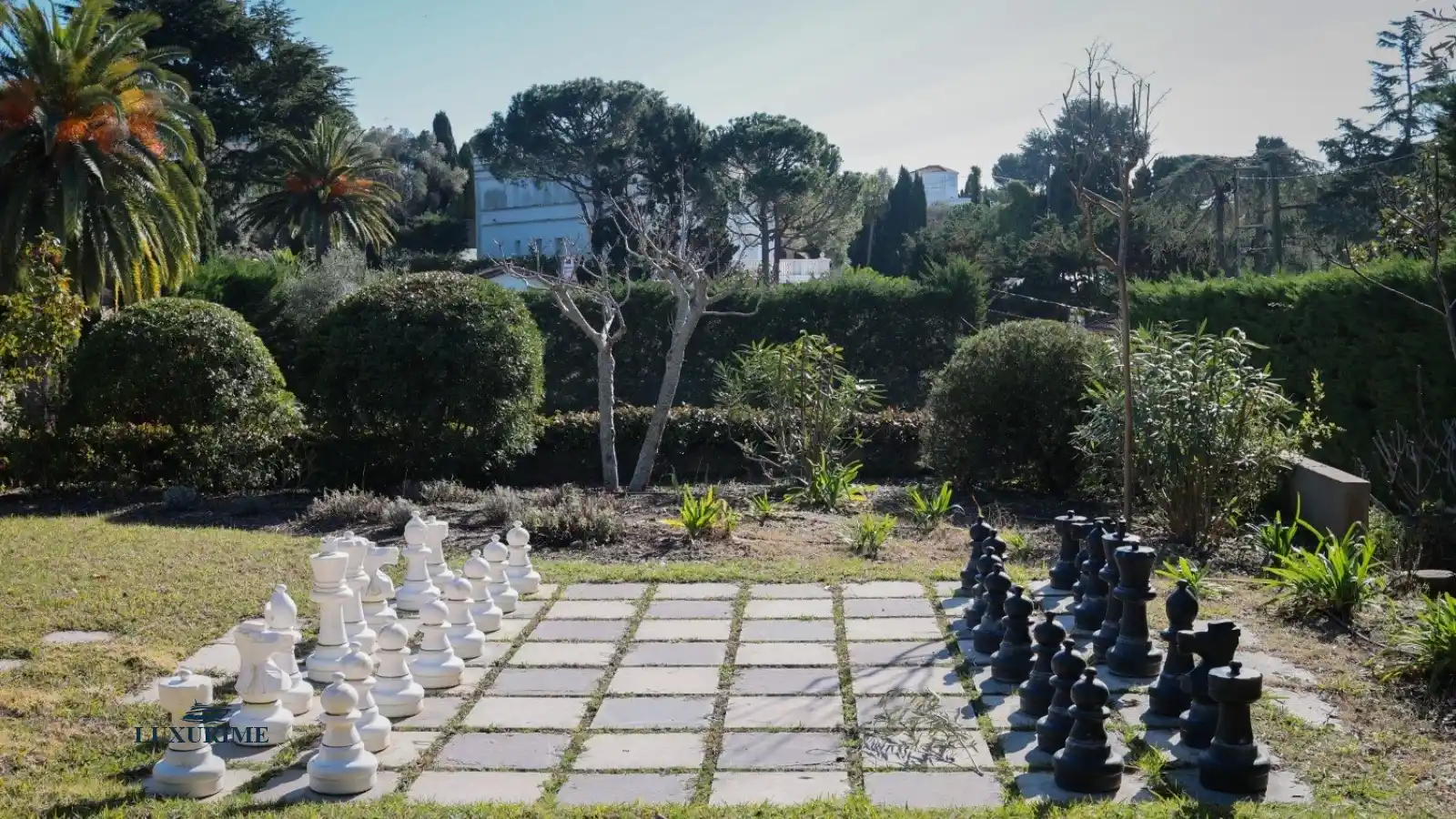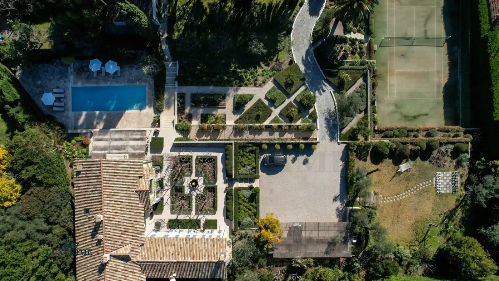 The villa’s expansive terrace, shaded by a traditional pergola, hosts an al fresco dining area and a chic summer lounge. A staircase leads to the heated swimming pool, surrounded by towering palms and fragrant pines. The meticulously landscaped gardens feature a fountain, giant chessboard, tennis court, and pétanque court, offering endless leisure possibilities. Ample parking is available for seven cars.