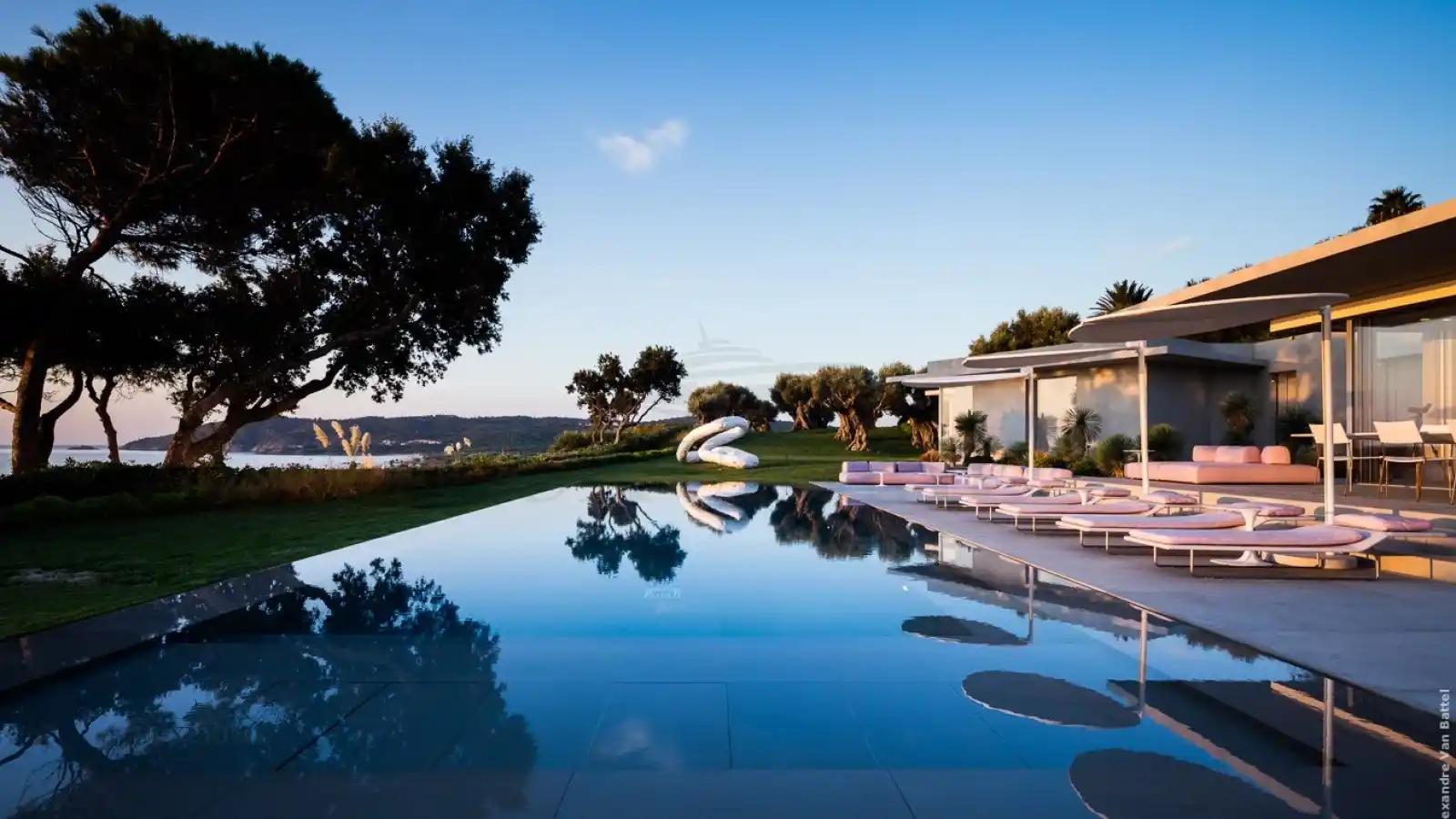 Surrounded by century-old olive trees and manicured gardens, the villa’s outdoor area is a haven of peace and pleasure. Stretch out under the sun on powder-pink loungers or take a dip in the heated mirror pool, which reflects the sky in cinematic perfection.
