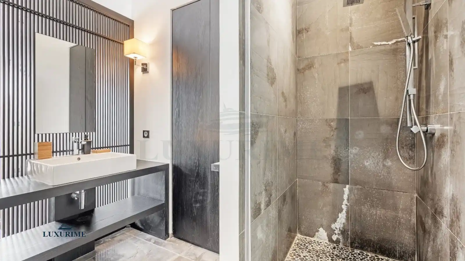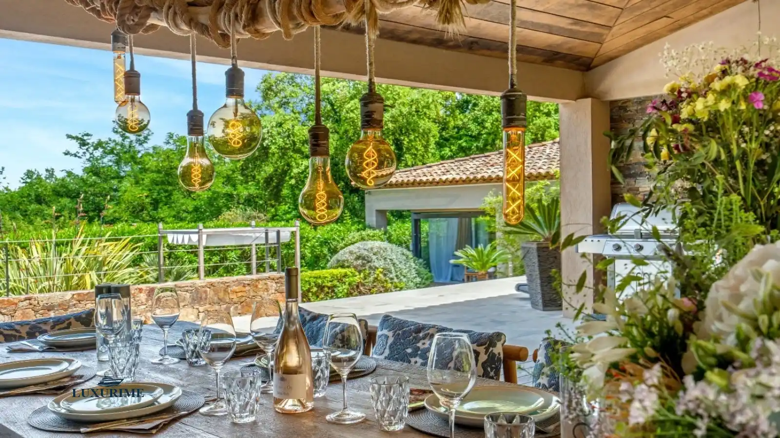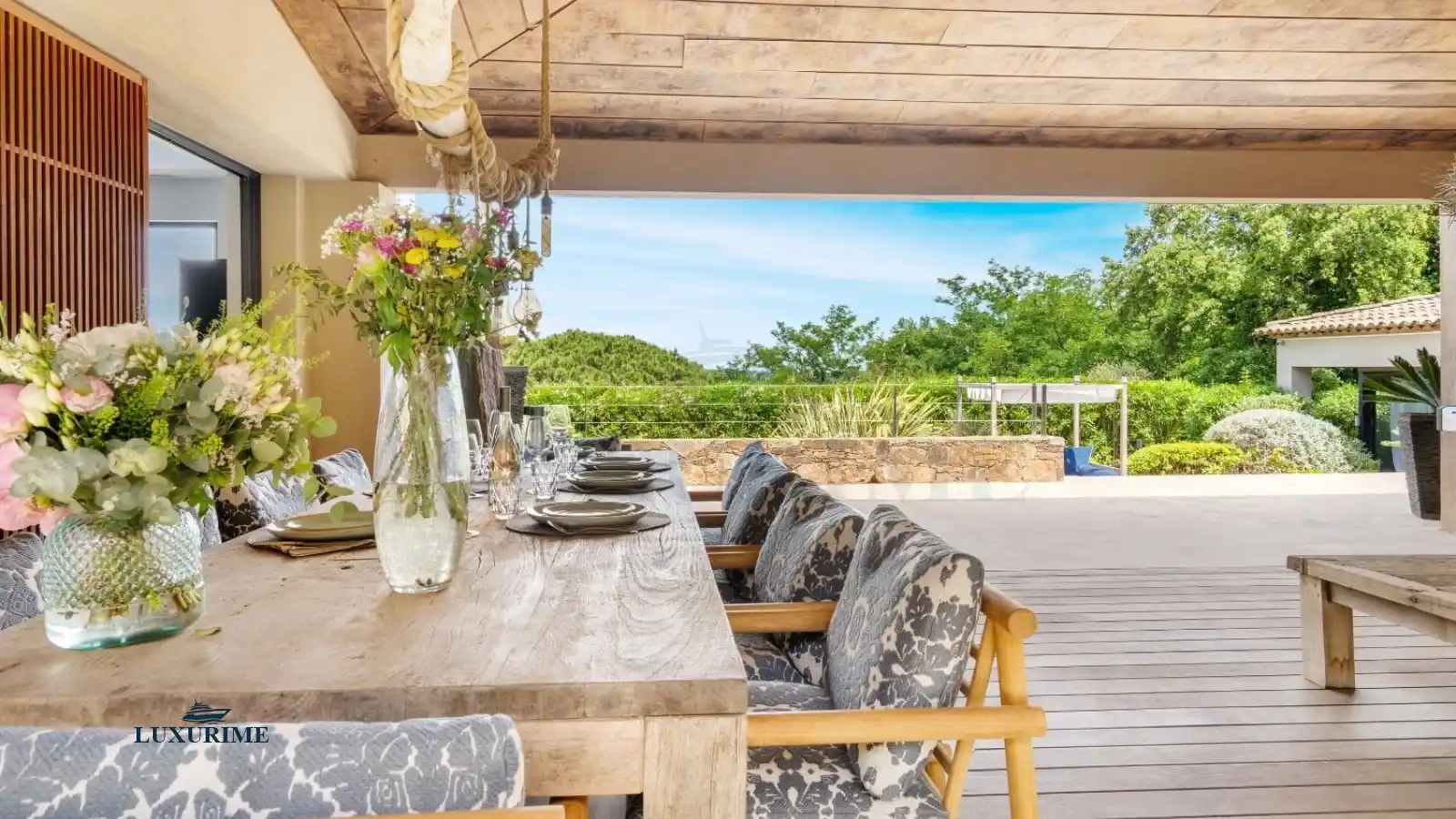 The communal areas, generous and inviting, lend themselves beautifully to lively lunches, leisurely aperitifs, and evenings under the stars. The indoor dining area extends naturally to a vast covered terrace where you can enjoy the Tropezian lifestyle, sheltered from the sun. The garden, a true park adorned with Mediterranean flora, becomes a natural playground for children, a peaceful promenade for elders, and a green haven for all.