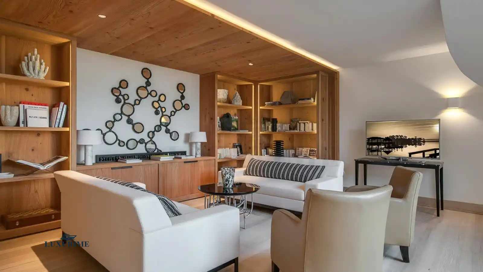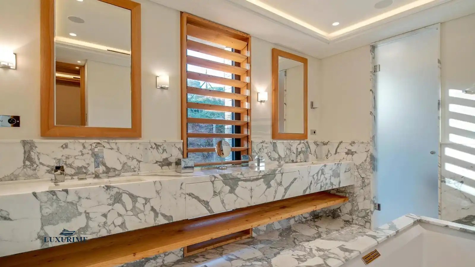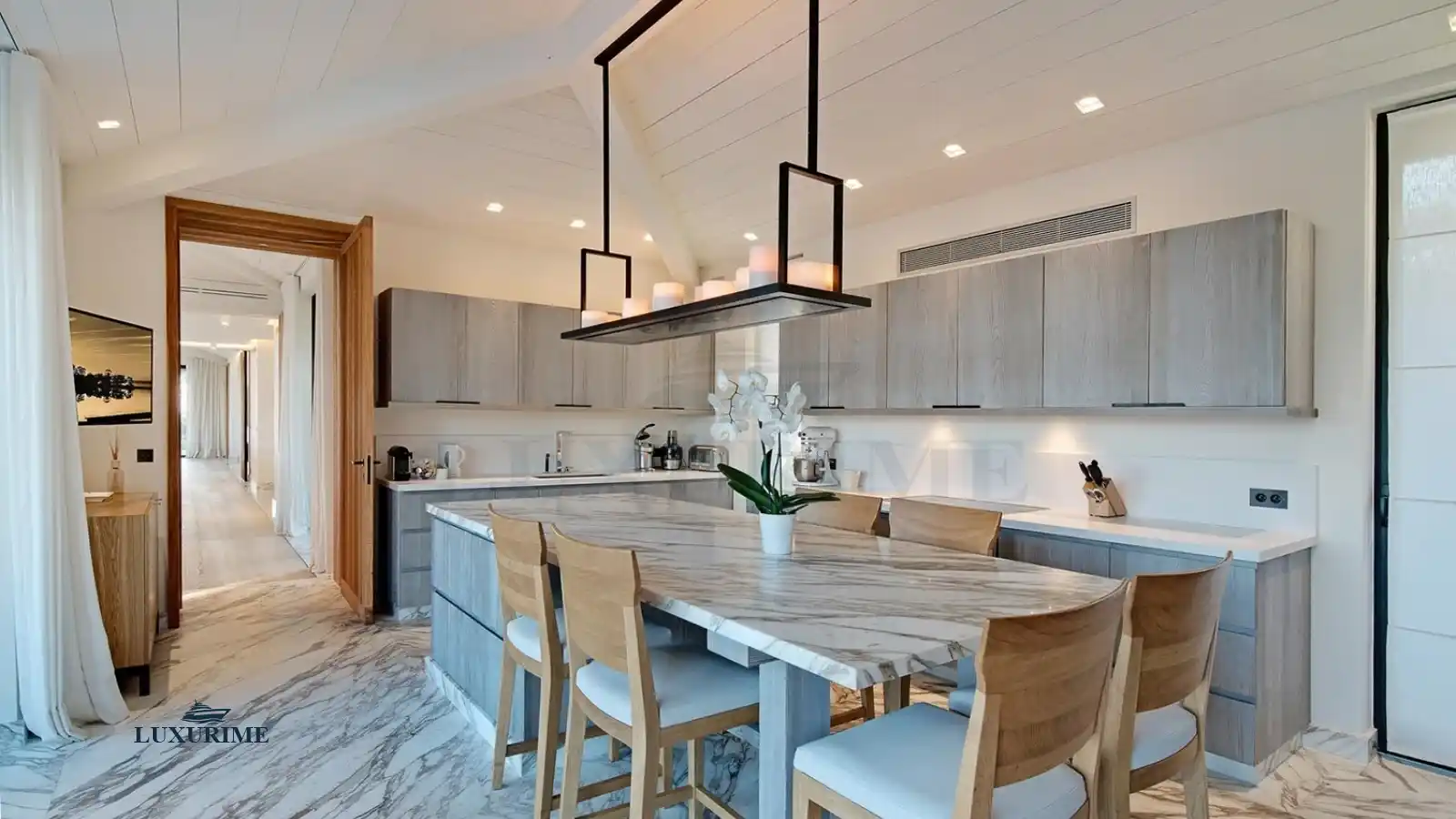Every detail of Villa Bellazard reflects modern refinement. Its double staircase creates an architectural focal point, while the interplay of natural wood and sleek marble infuses warmth into the villa’s interiors. A lounge-library provides a refined corner for relaxation, while wide-open spaces and seamless indoor-outdoor flow invite guests to savor the Mediterranean lifestyle.