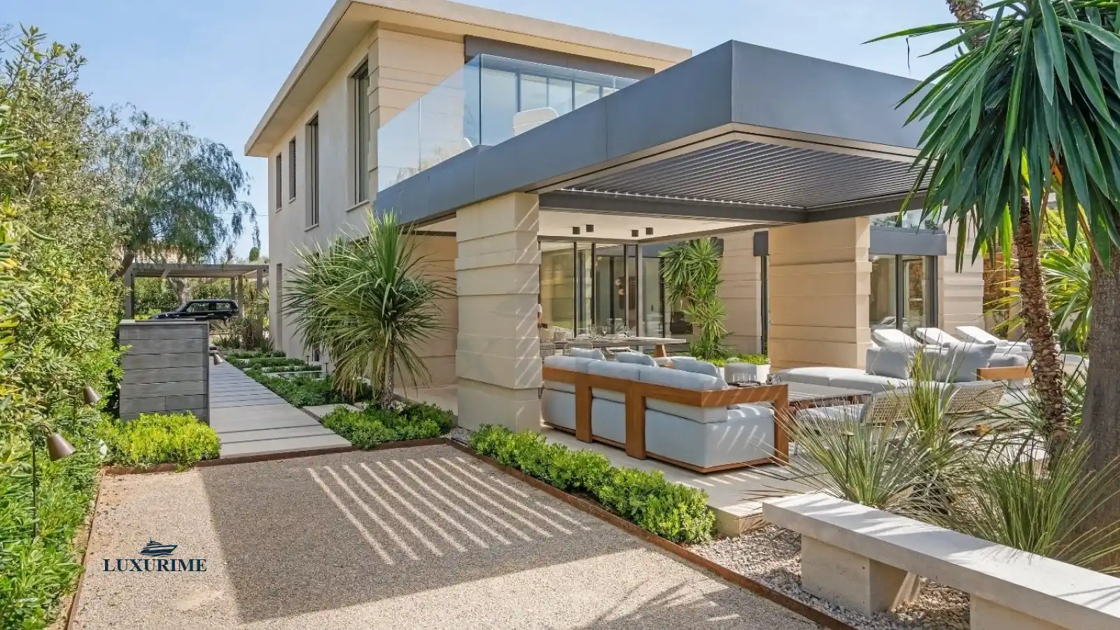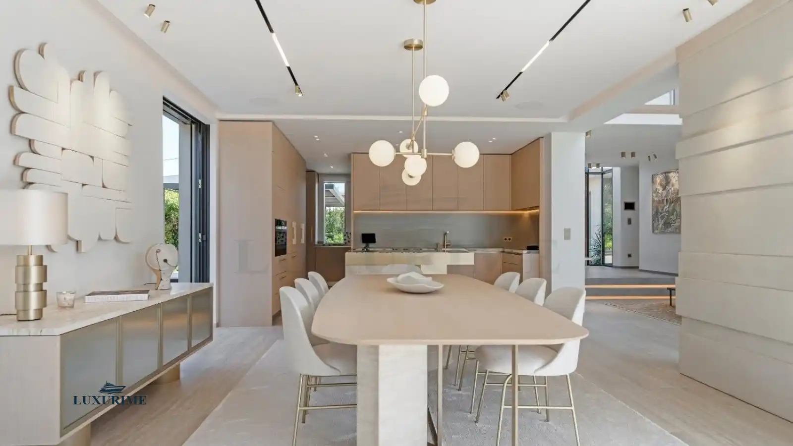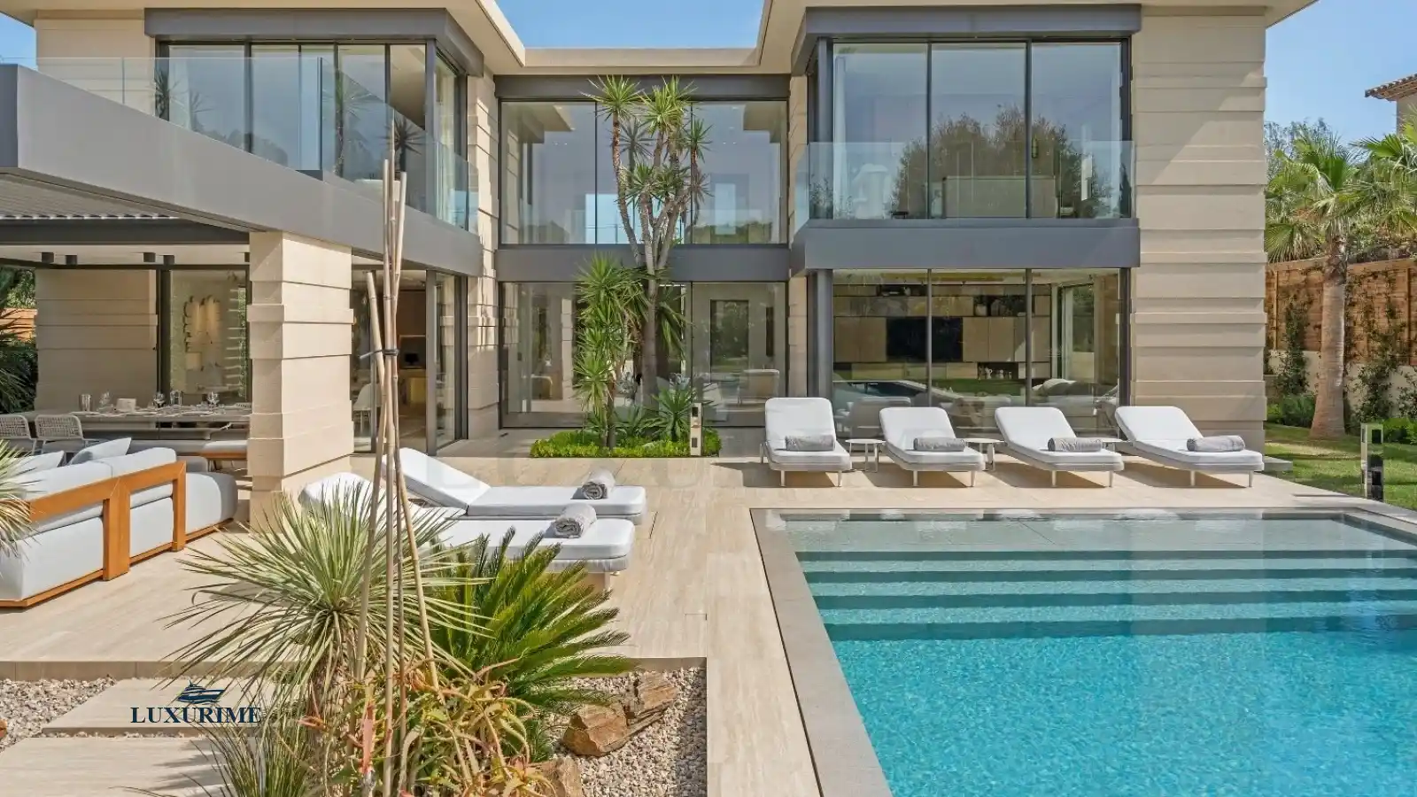 From the moment you arrive, the villa’s pure and elegant design captivates the senses. Expansive floor-to-ceiling windows dissolve the boundaries between indoor and outdoor living, bathing the interior in natural light. A soft, neutral palette of beige, enhanced by delicate textures and rich materials, creates an ambiance of serene elegance. Outside, the meticulously landscaped garden, adorned with fragrant Mediterranean flora and stately palm trees, features stone pathways that weave between tranquil lounge areas, fostering a beautiful and harmonious dialogue between nature and modern architecture.