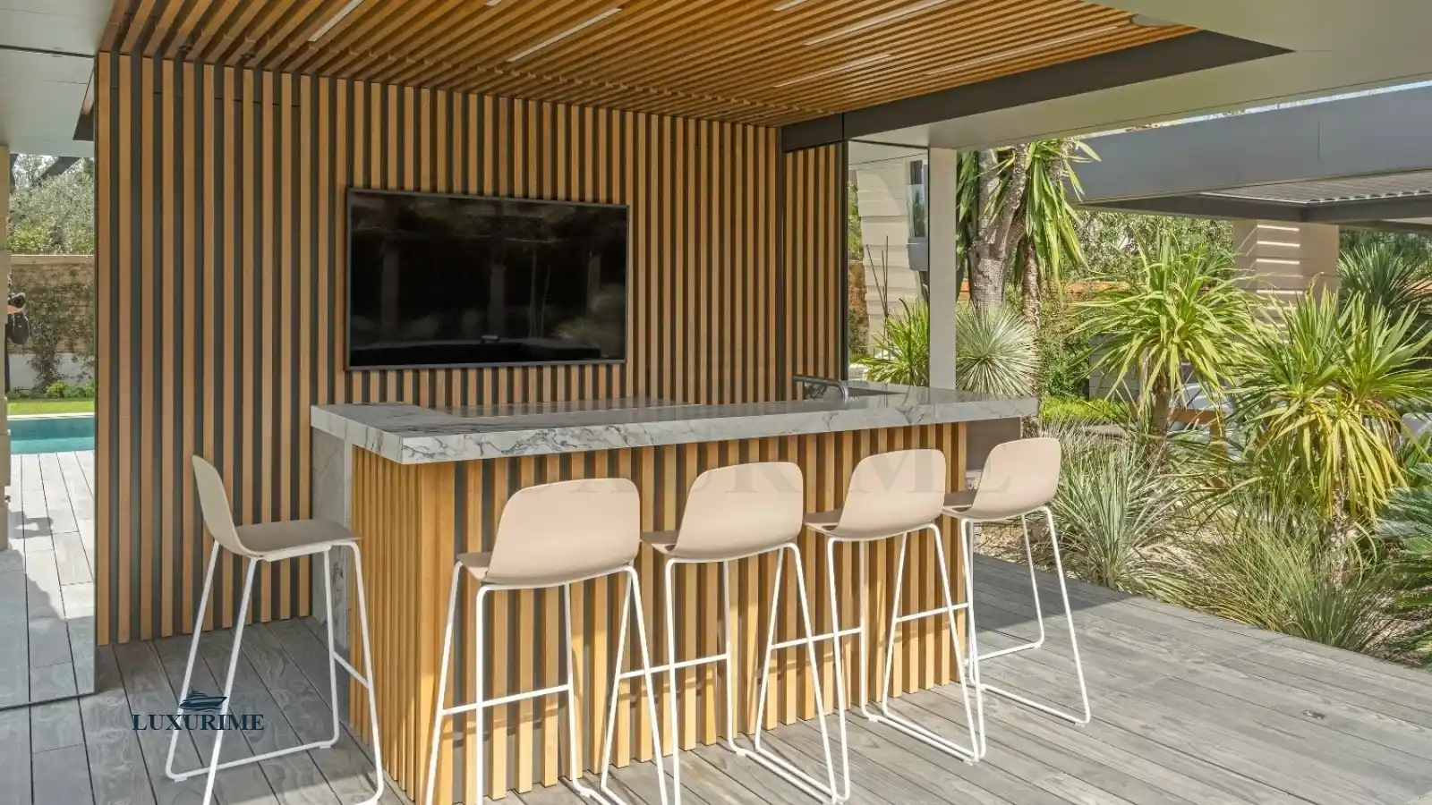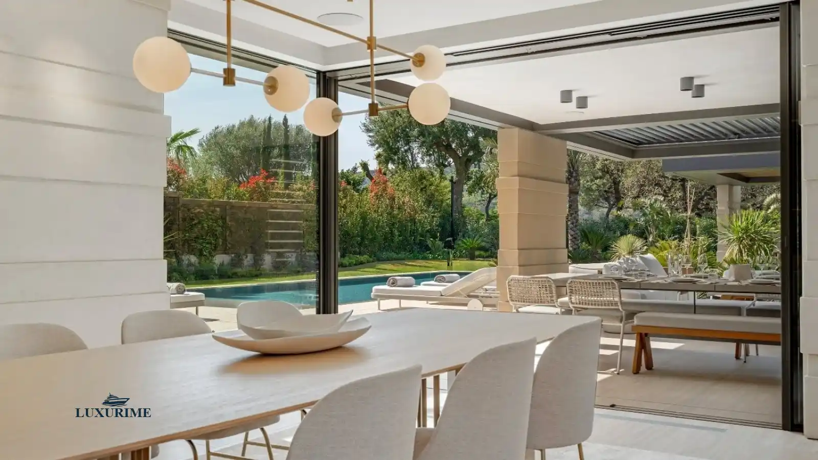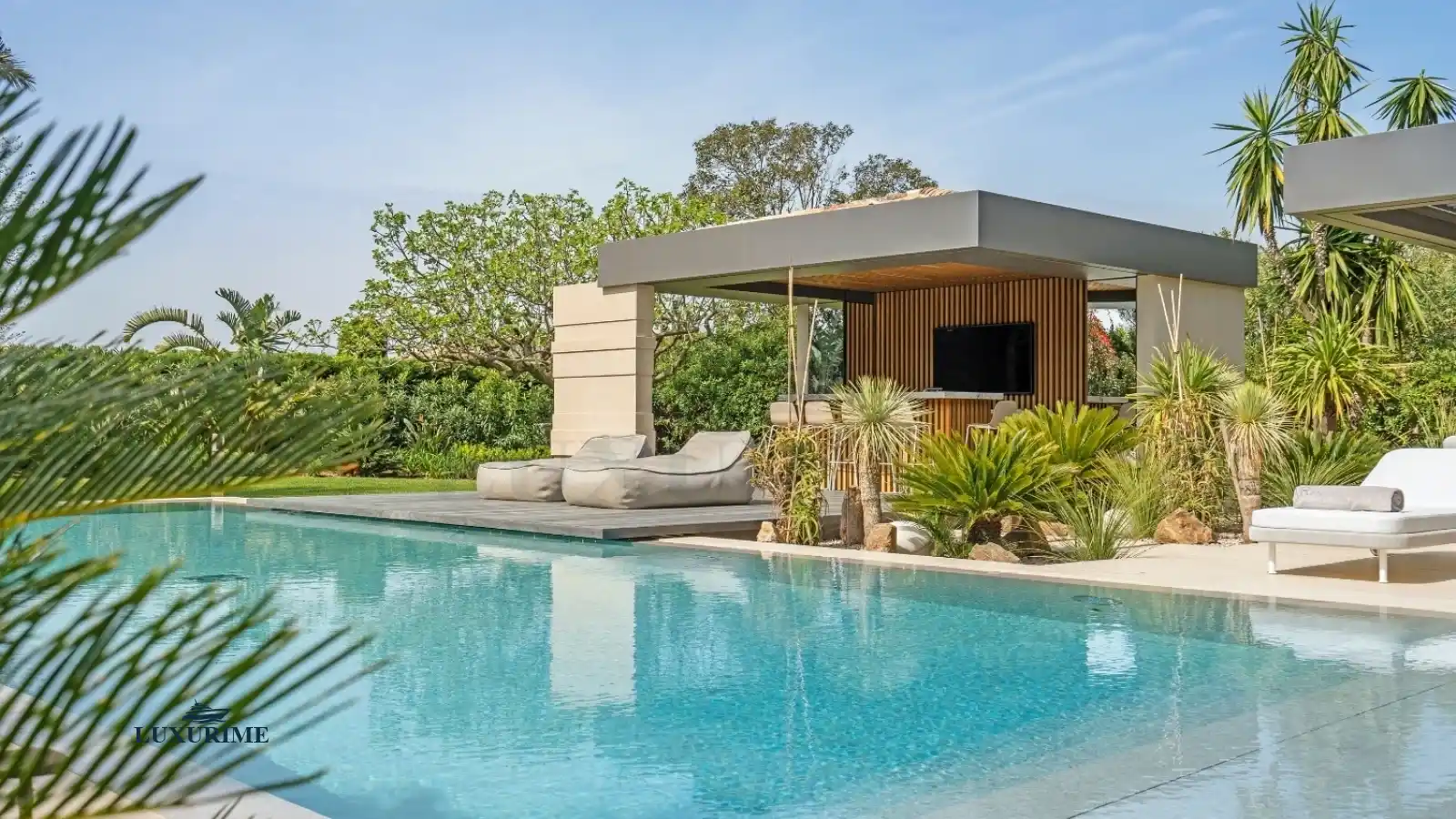 From the moment you arrive, the villa’s pure and elegant design captivates the senses. Expansive floor-to-ceiling windows dissolve the boundaries between indoor and outdoor living, bathing the interior in natural light. A soft, neutral palette of beige, enhanced by delicate textures and rich materials, creates an ambiance of serene elegance. Outside, the meticulously landscaped garden, adorned with fragrant Mediterranean flora and stately palm trees, features stone pathways that weave between tranquil lounge areas, fostering a beautiful and harmonious dialogue between nature and modern architecture.