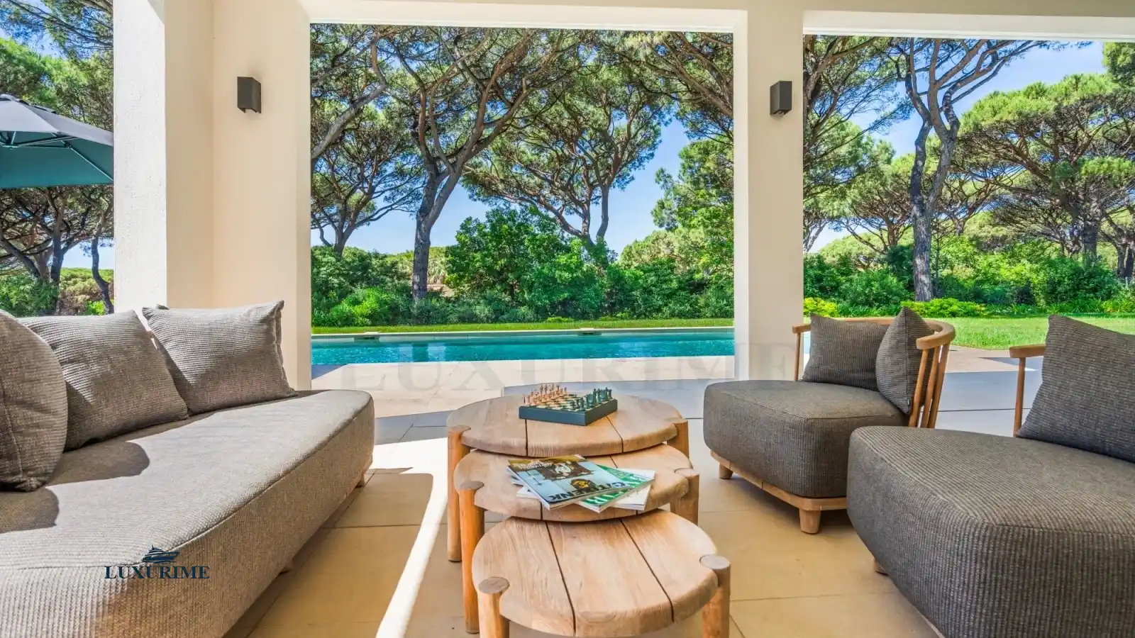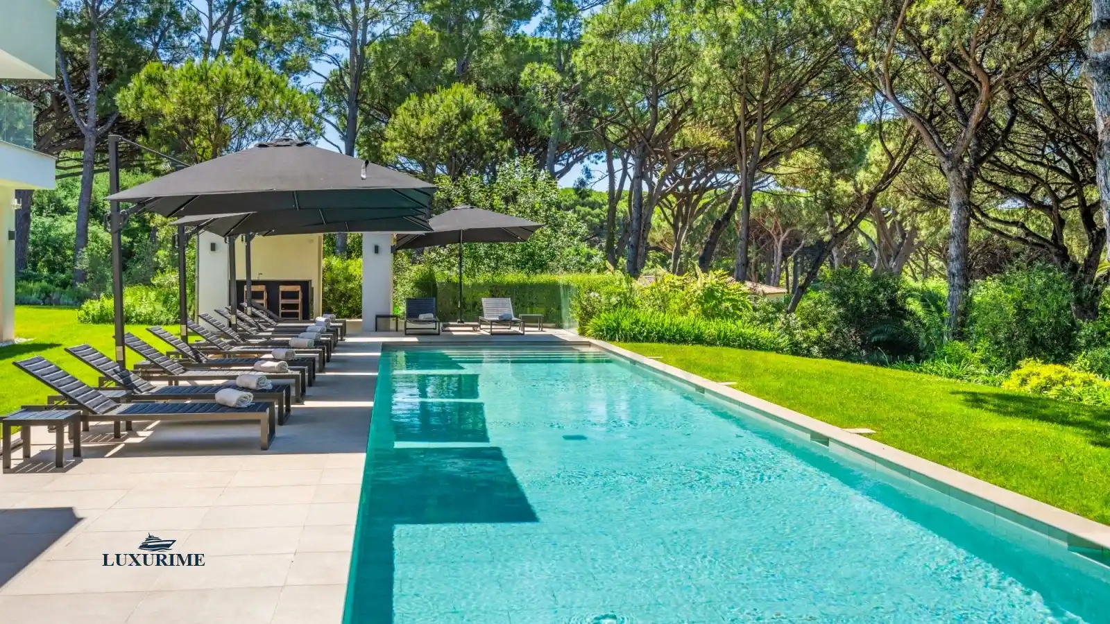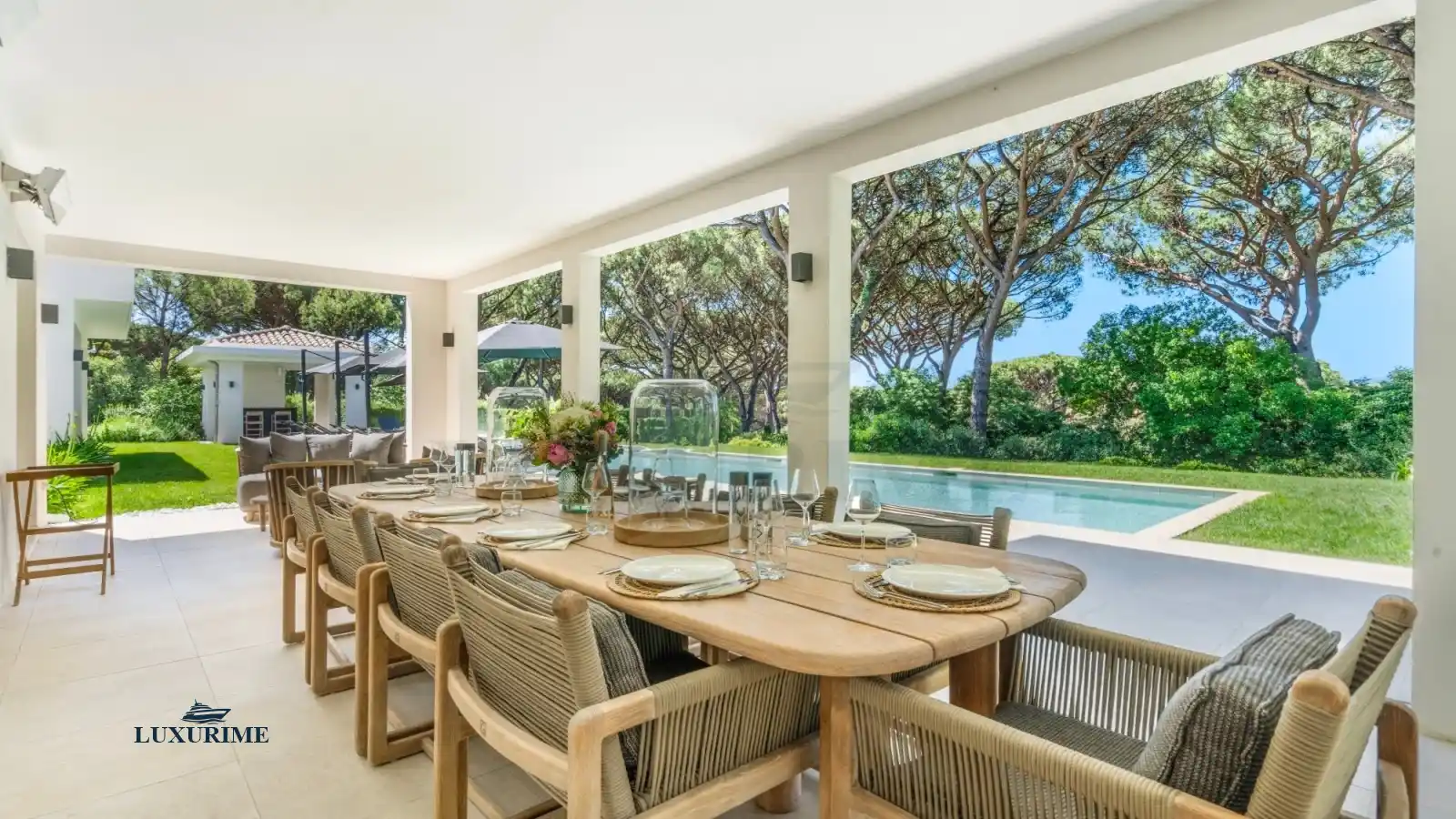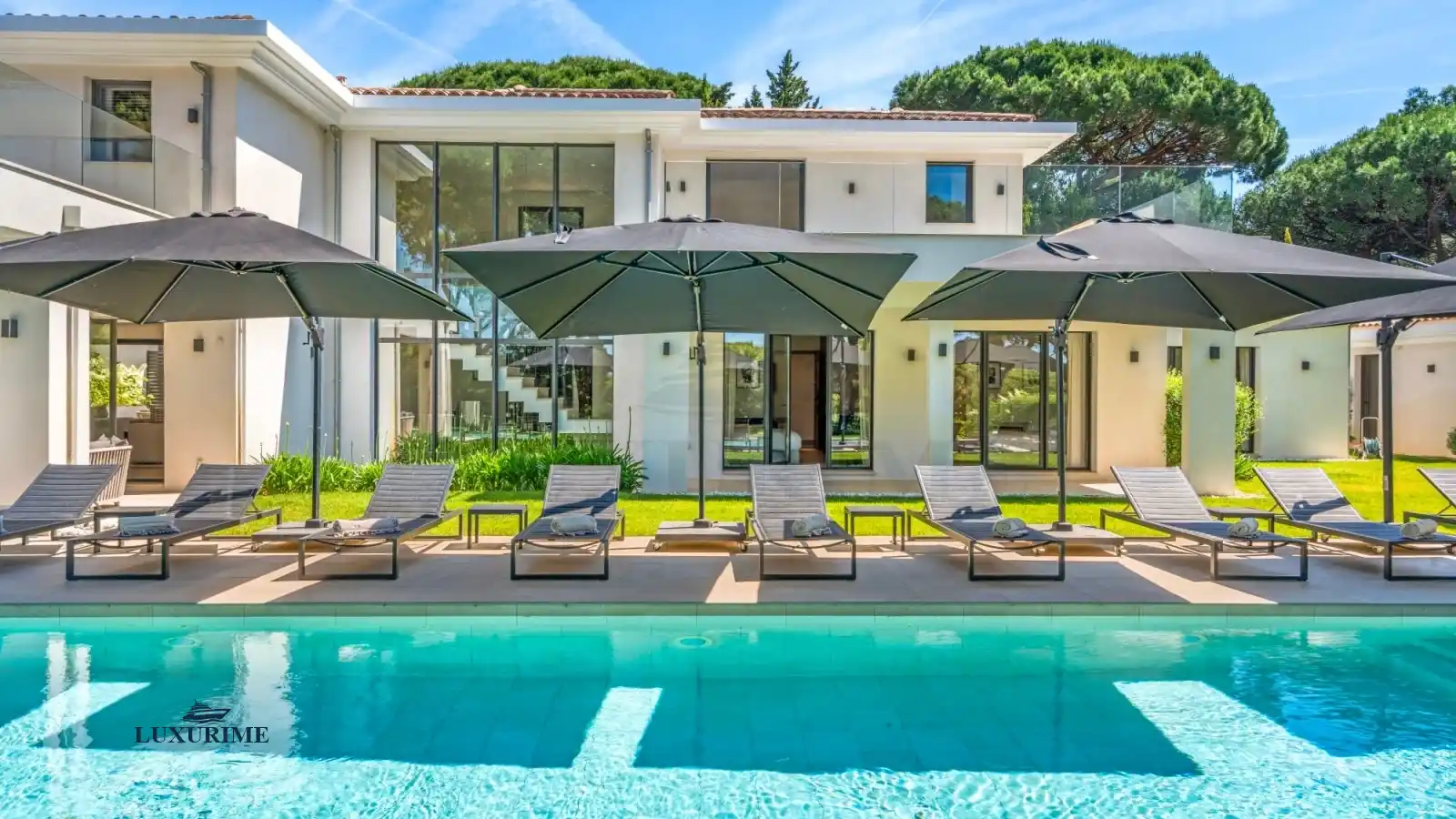 The villa’s exterior is a sanctuary in itself. Wide glass doors open onto shaded pergolas, elegant dining areas, and comfortable loungers. At the heart of it all lies the stunning azure-blue swimming pool, bordered by pale stone and shaded by pine trees.