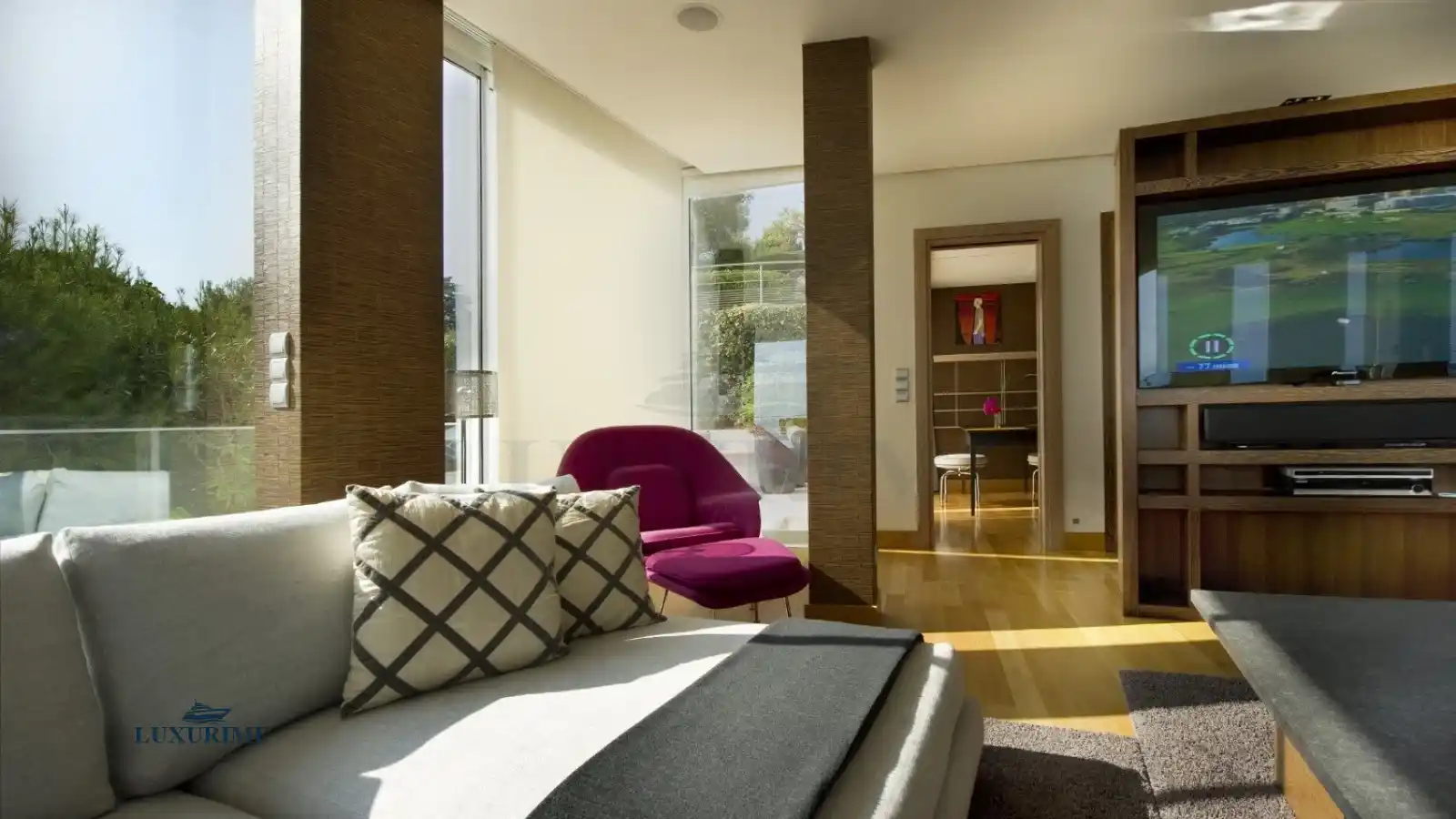 Villa Harmonia blends modern sophistication with timeless charm, featuring expansive, light-filled interiors designed for comfort and grandeur. The spacious living room boasts floor-to-ceiling windows framing the azure sea, while the elegant dining room opens onto a sun-drenched terrace, perfect for al fresco gatherings. A state-of-the-art kitchen equipped with premium appliances caters to every culinary need, complemented by a professional-grade kitchen for private chefs preparing gourmet meals.