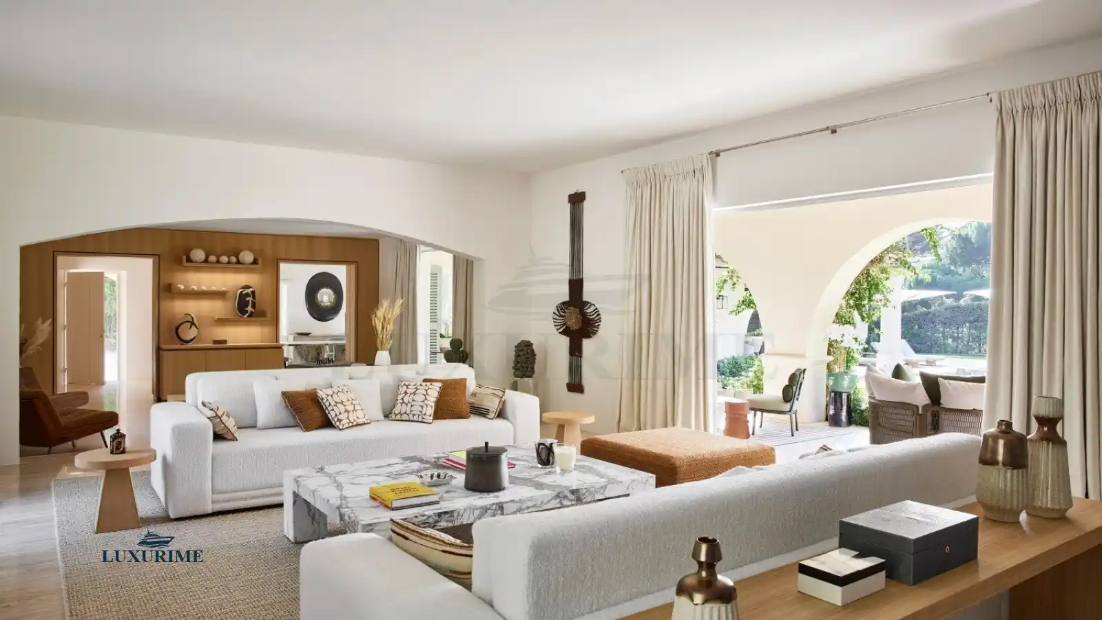 The villa's interior is a masterclass in contemporary elegance, curated by renowned interior designer Stéphanie Coutas. She has skillfully blended a nautical-inspired theme with a warm, residential feel, playing with rich materials, sumptuous textures, and an evocative color palette. Marble, custom fabrics, and warm woods mingle in perfect harmony, giving the villa a profound soul. The décor, adorned in warm hues of khaki, burgundy, and yellow, evokes the intimate and cozy ambiance of a luxurious Moroccan riad, with rooms bathed in abundant natural light.