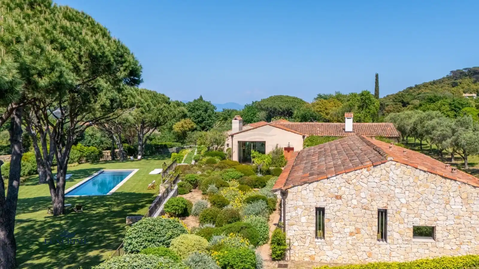 Secure & Private: The fully secured property, shaded by majestic umbrella pines, offers peace and total seclusion, all while boasting a beautiful sea view.