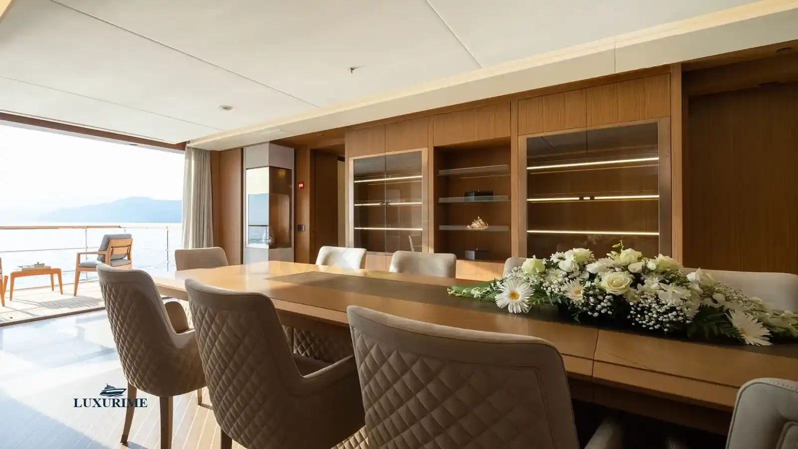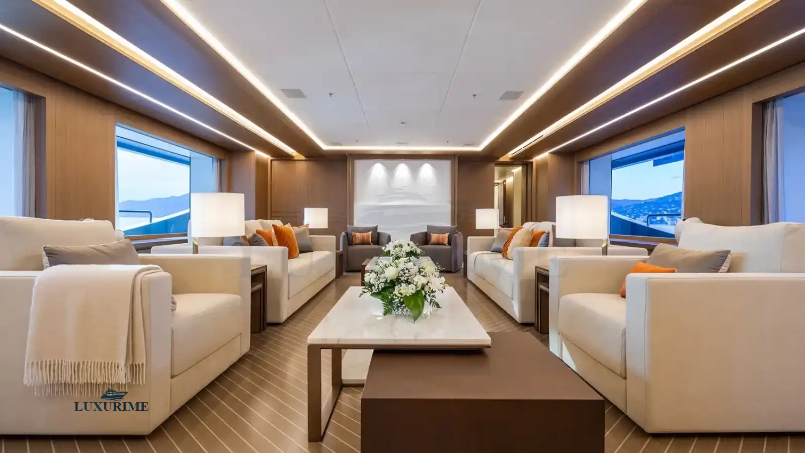 A main salon with plush seating, a formal dining area, and large windows for panoramic sea views.
