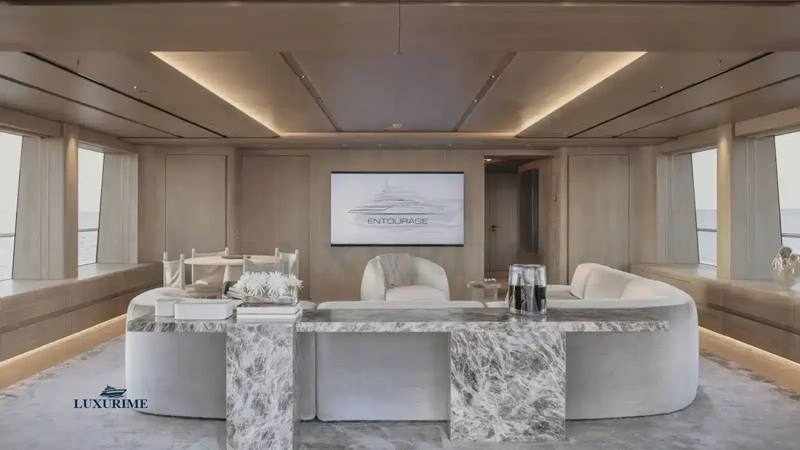 Designed by Laura Sessa, ENTOURAGE’s interiors exude modern elegance with a neutral palette, rich textures, and bespoke finishes. Accommodating 12 guests in 6 lavish staterooms, including a full-beam master suite with private terrace, two VIP suites, and three doubles, every space is crafted for comfort and style.