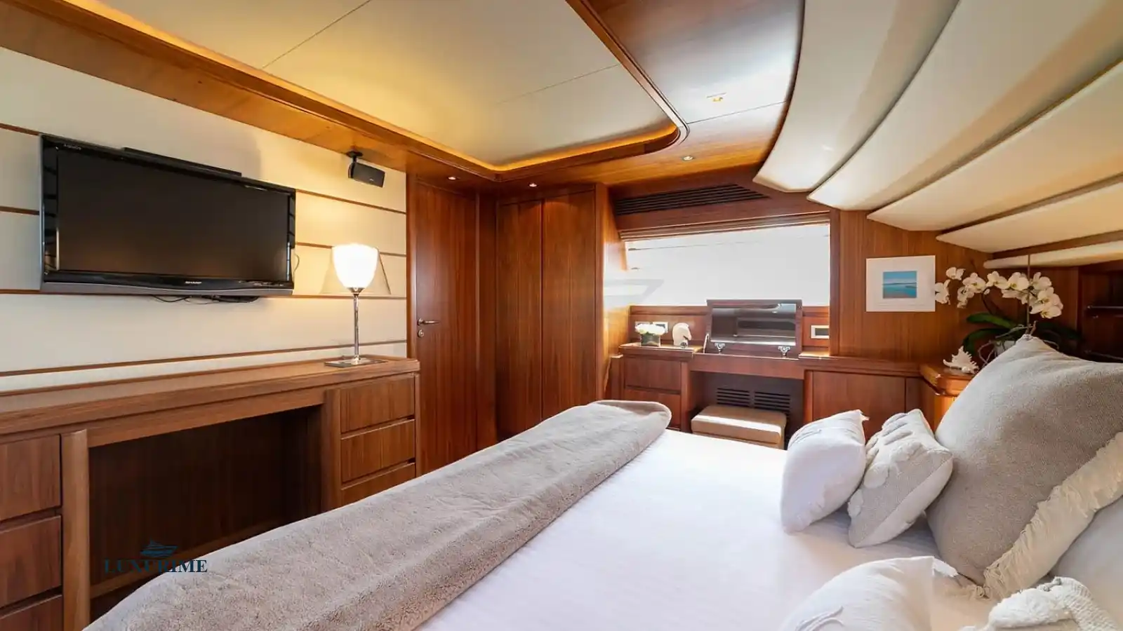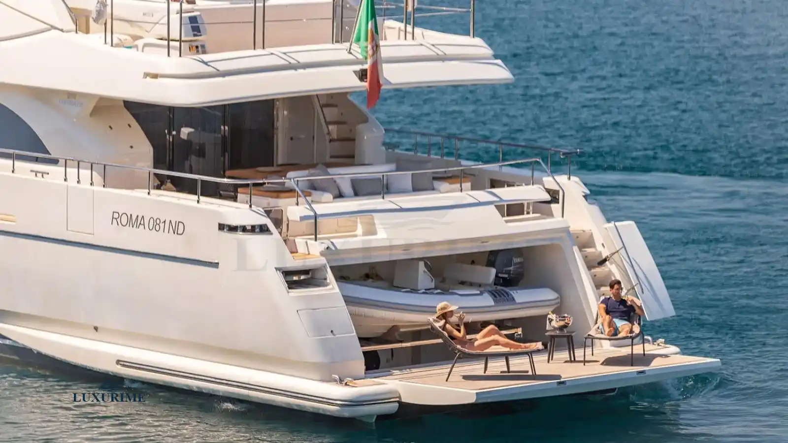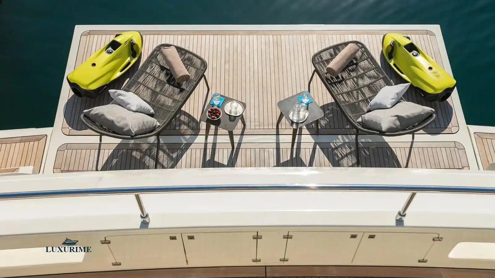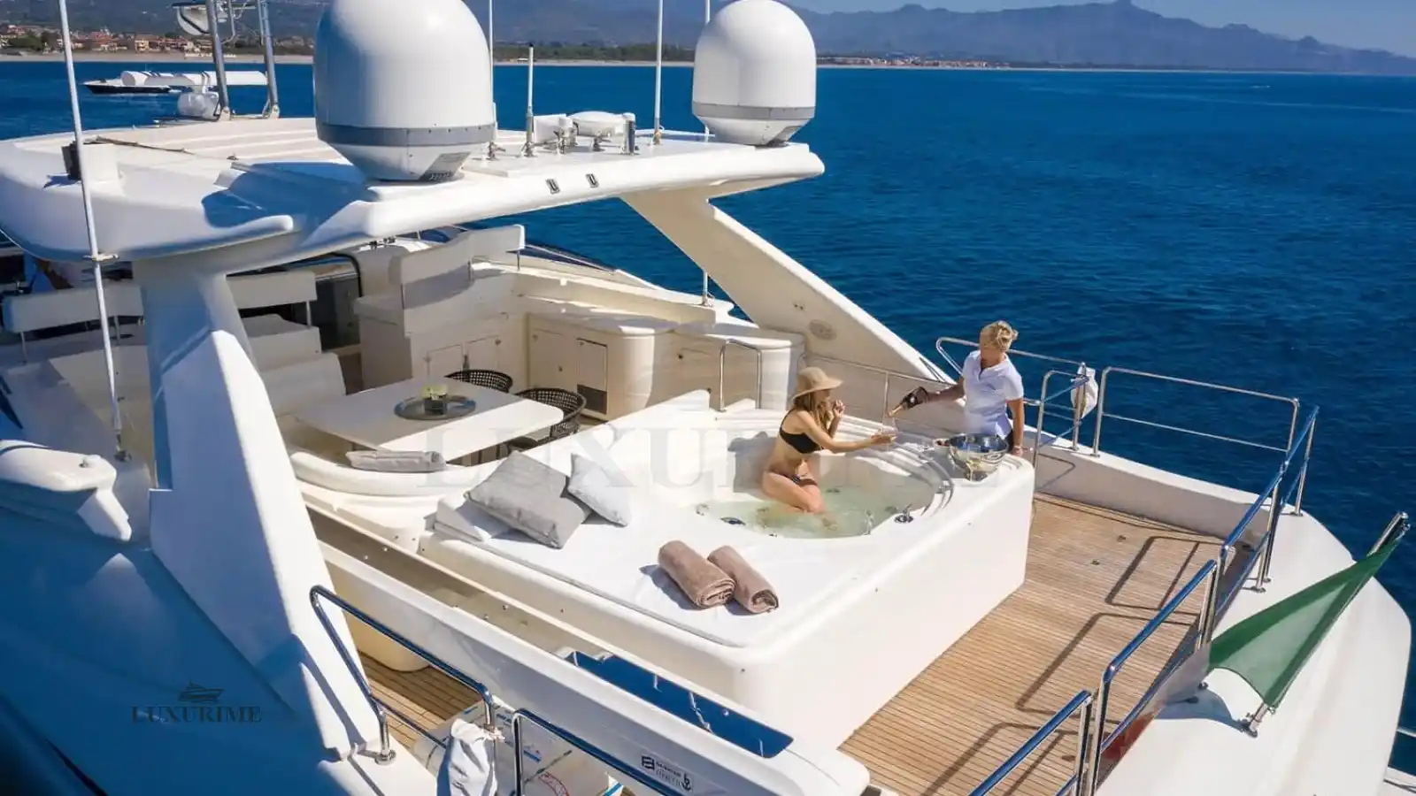 Sun worshippers can unwind on the flybridge sunpads or enjoy alfresco dining on the aft deck, surrounded by the sparkling Mediterranean.