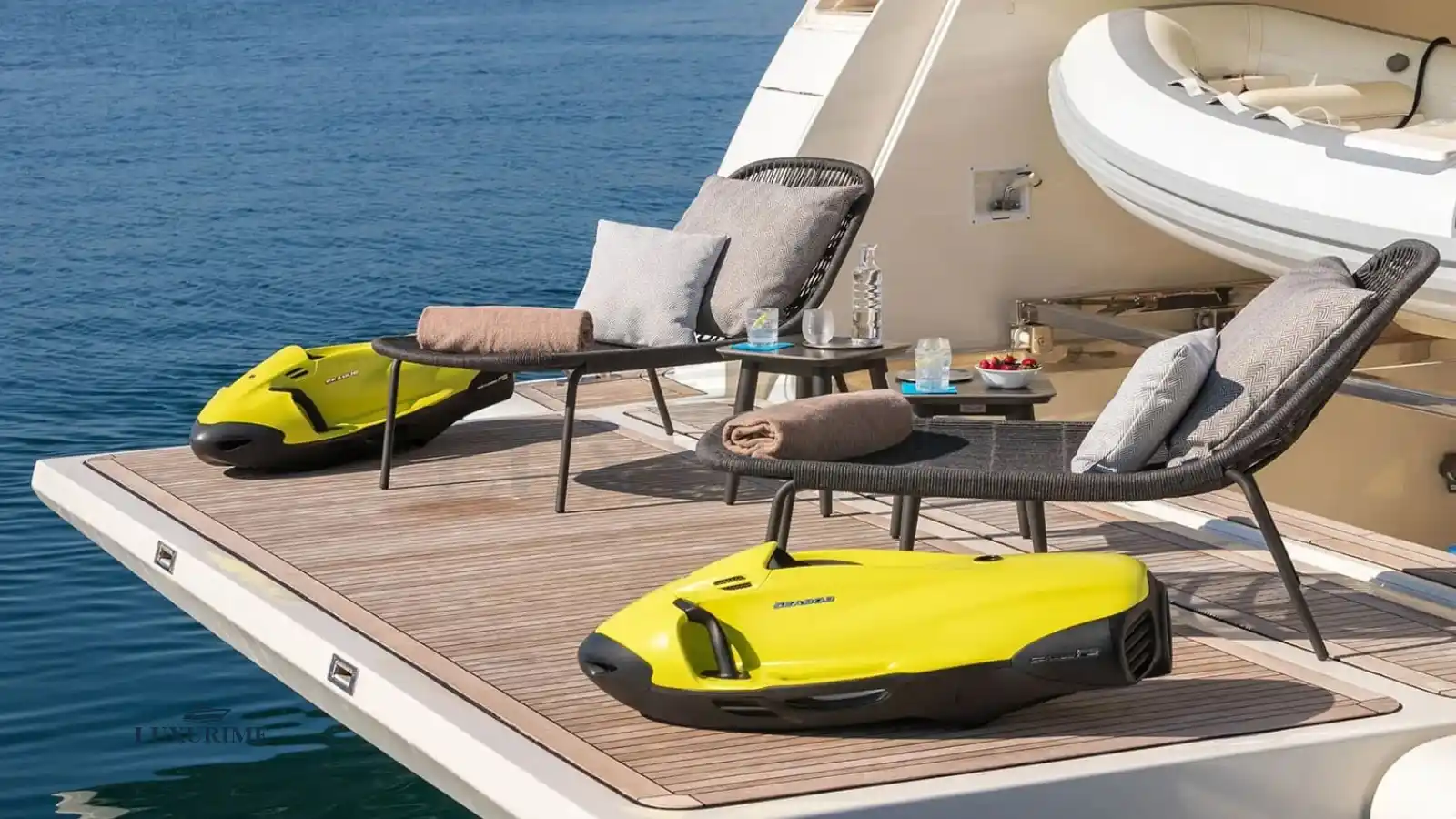 Designed for indulgence, ETHNA’s expansive flybridge is the ideal spot to soak in panoramic views while lounging in the jacuzzi or sipping cocktails crafted by the professional crew of five. The retractable swim platform provides easy access to the water, where an array of toys and equipment await: