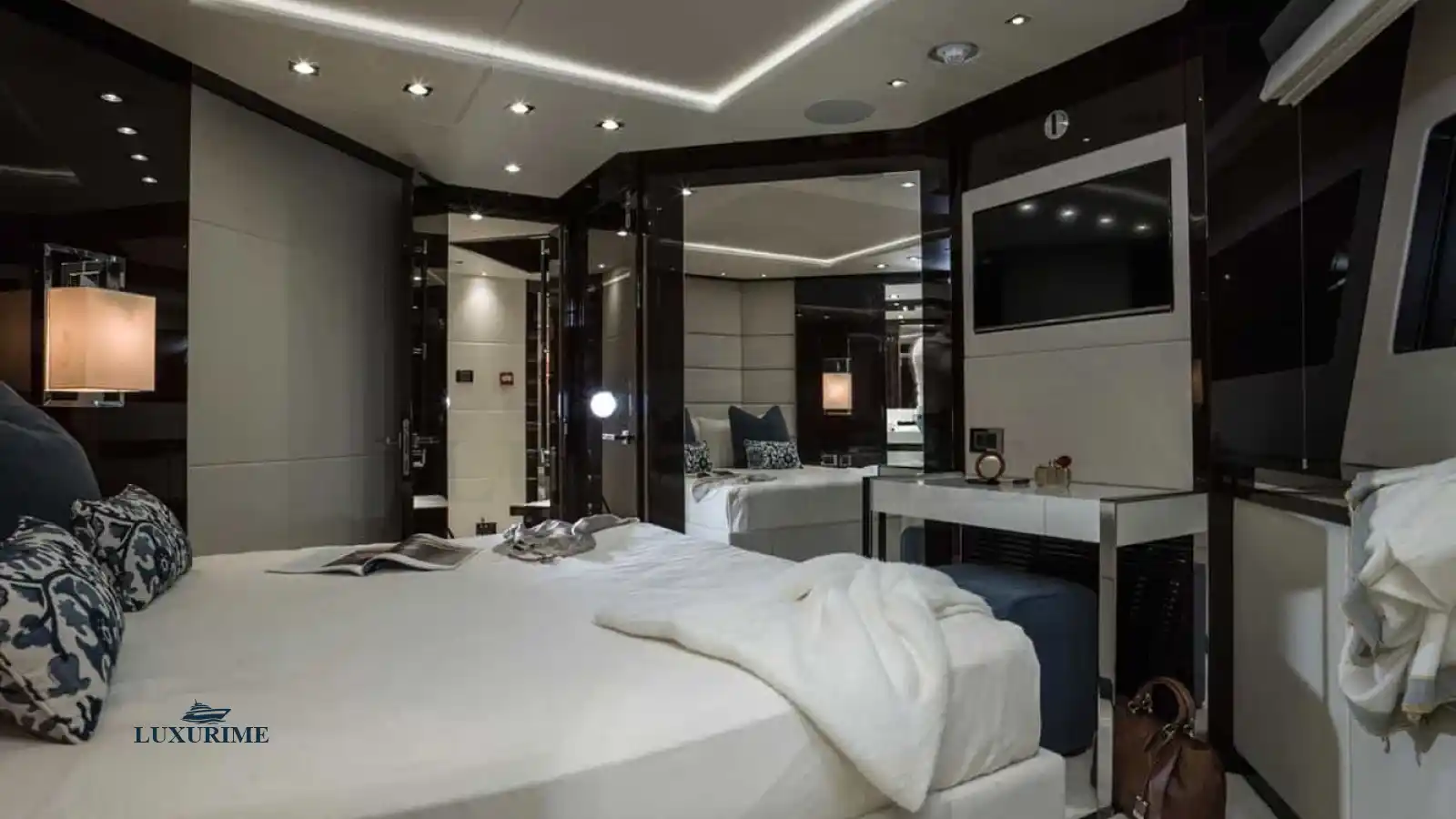 Expansive Fly Bridge – A sun-drenched oasis with loungers, a dining area, and a Jacuzzi for soaking in panoramic views.