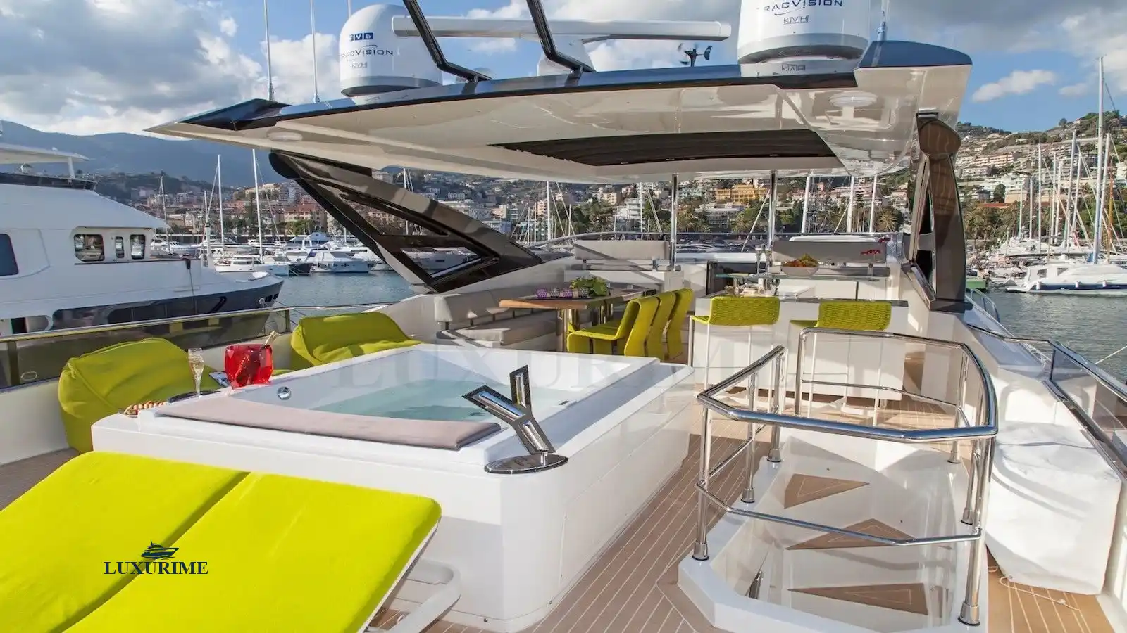 Flybridge – The heart of outdoor living, featuring a luxurious Jacuzzi, sun pads, and a lounge area for cocktails with panoramic views