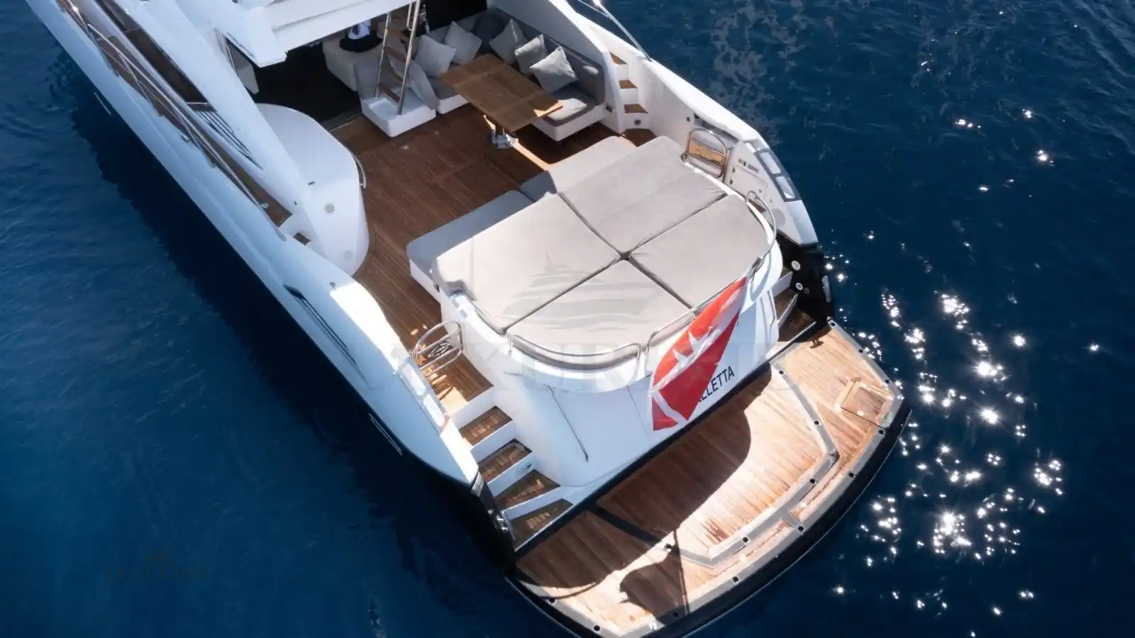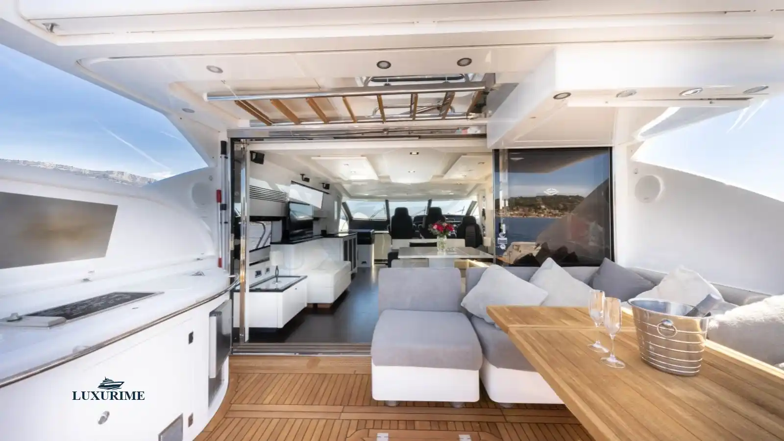 Fly Bridge – A stunning upper deck with sun loungers, seating, and panoramic views.