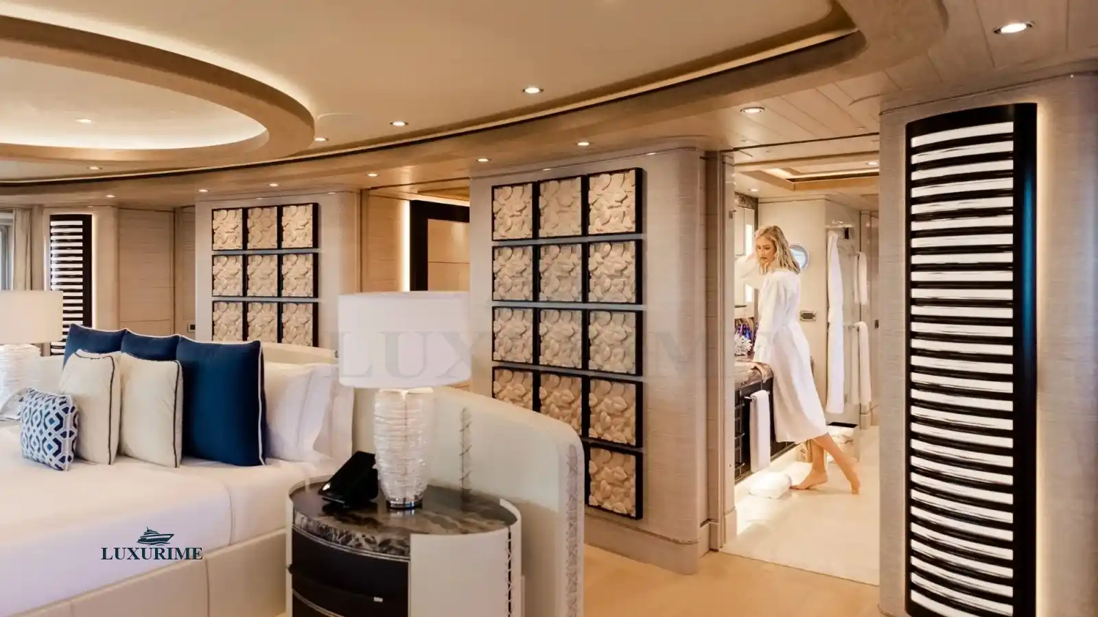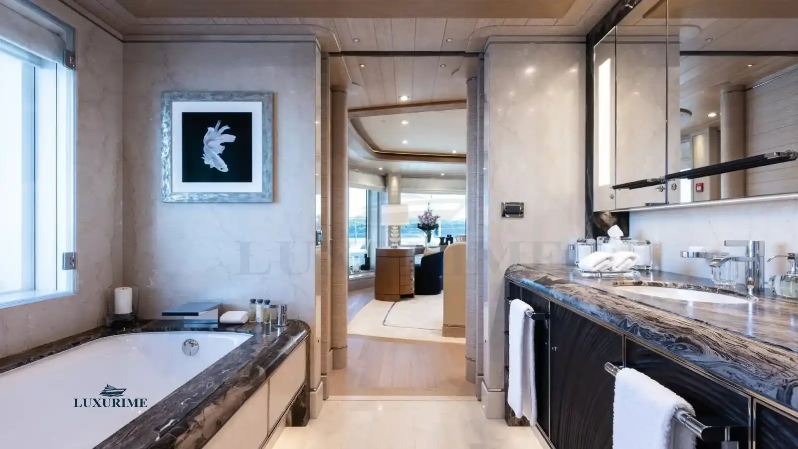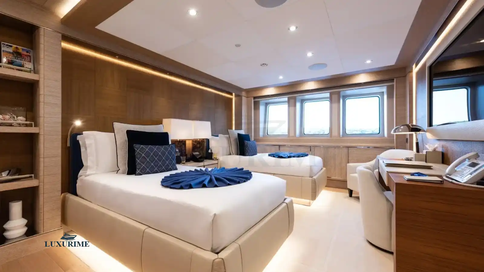 • Master Suite: Full-beam master stateroom with a king-sized bed, private lounge, and en-suite bathroom