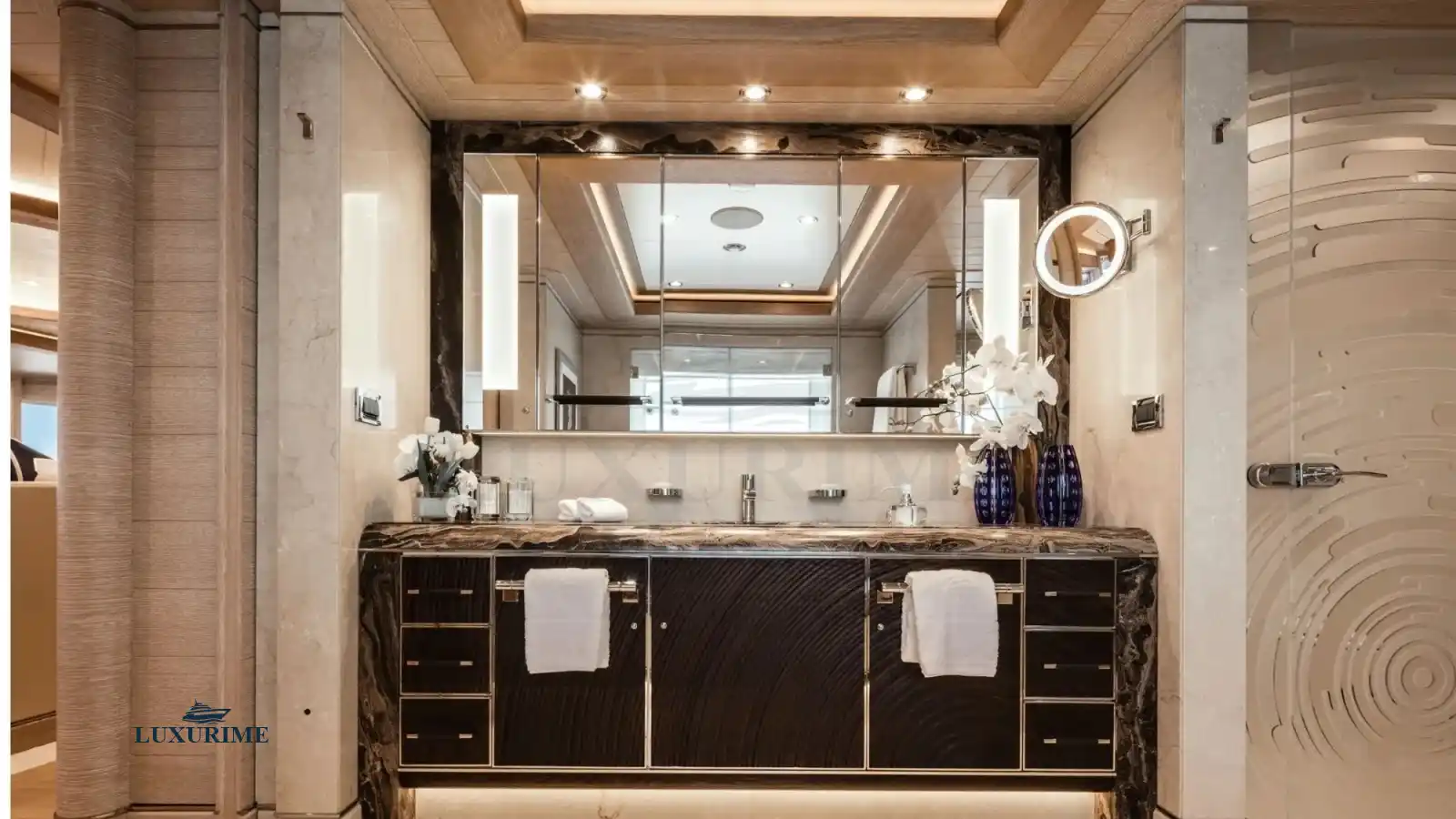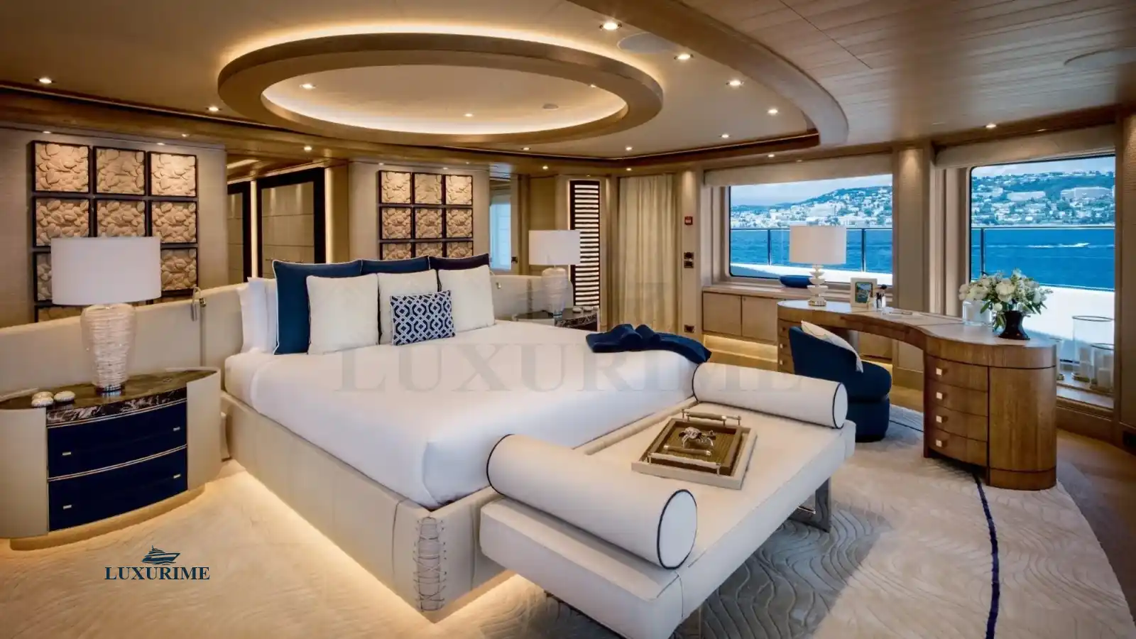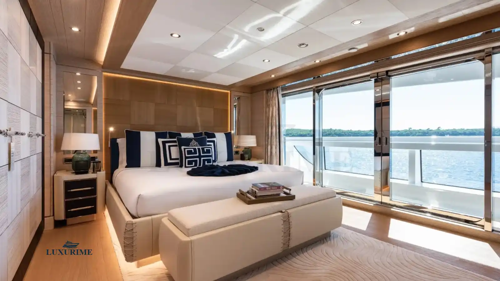 • Master Suite: Full-beam master stateroom with a king-sized bed, private lounge, and en-suite bathroom