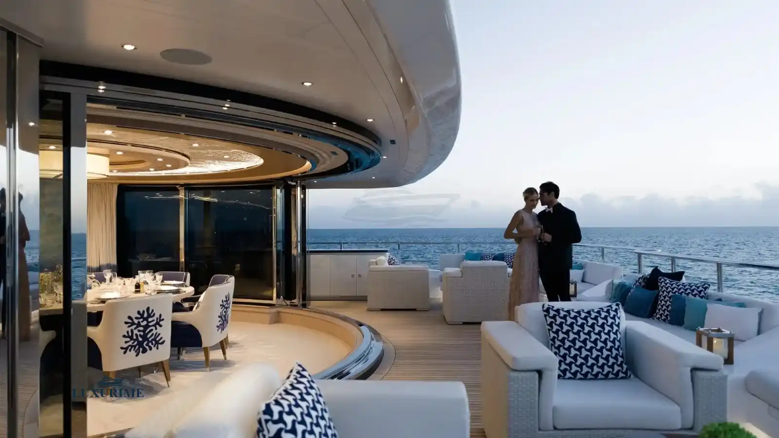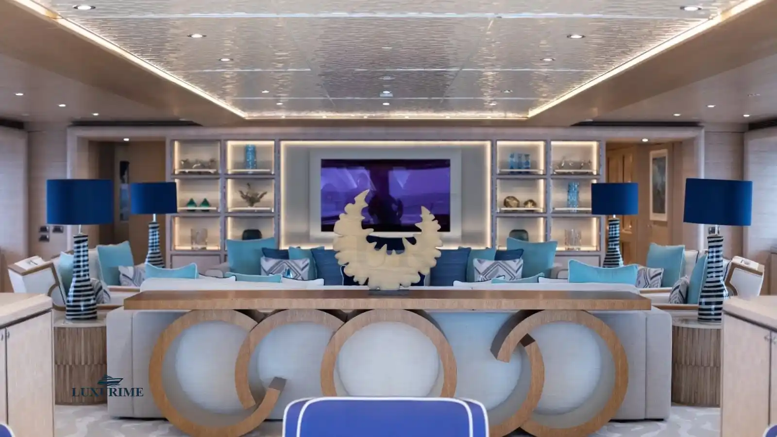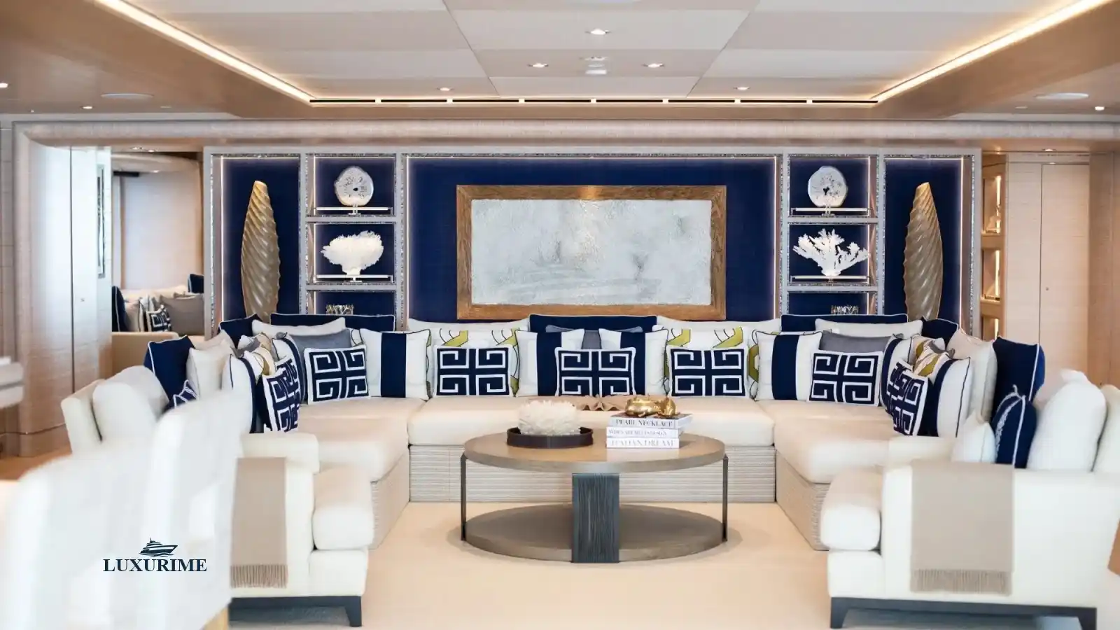 • Main Salon: Expansive lounge area with plush seating, a formal dining space, and panoramic windows for breathtaking views