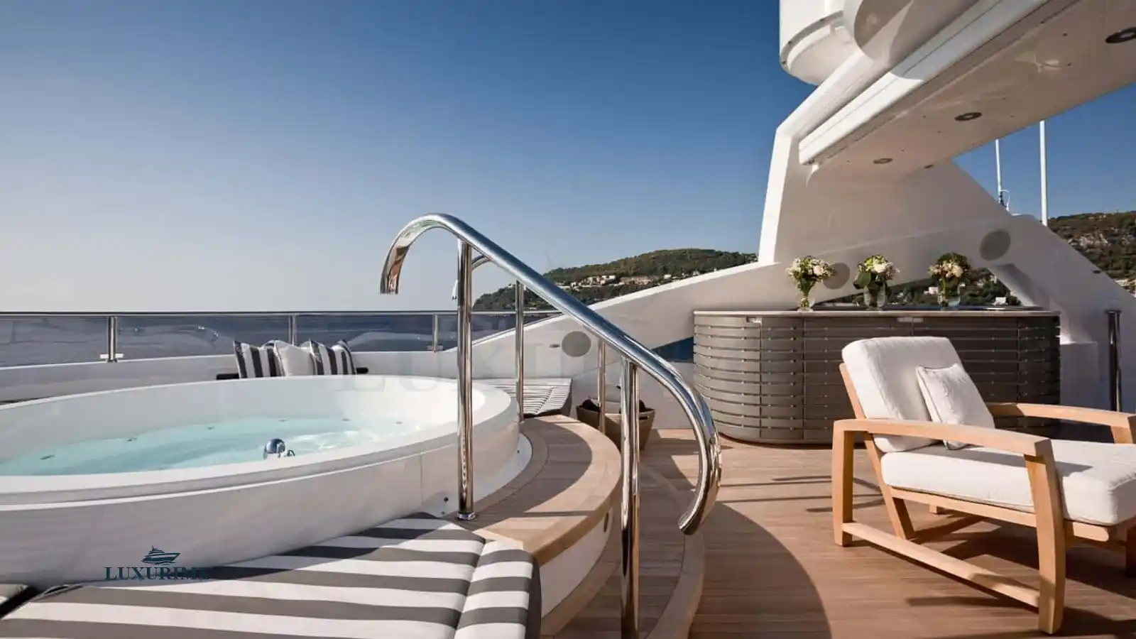 Expansive Sun Deck with a Jacuzzi, sunpads, and al fresco dining